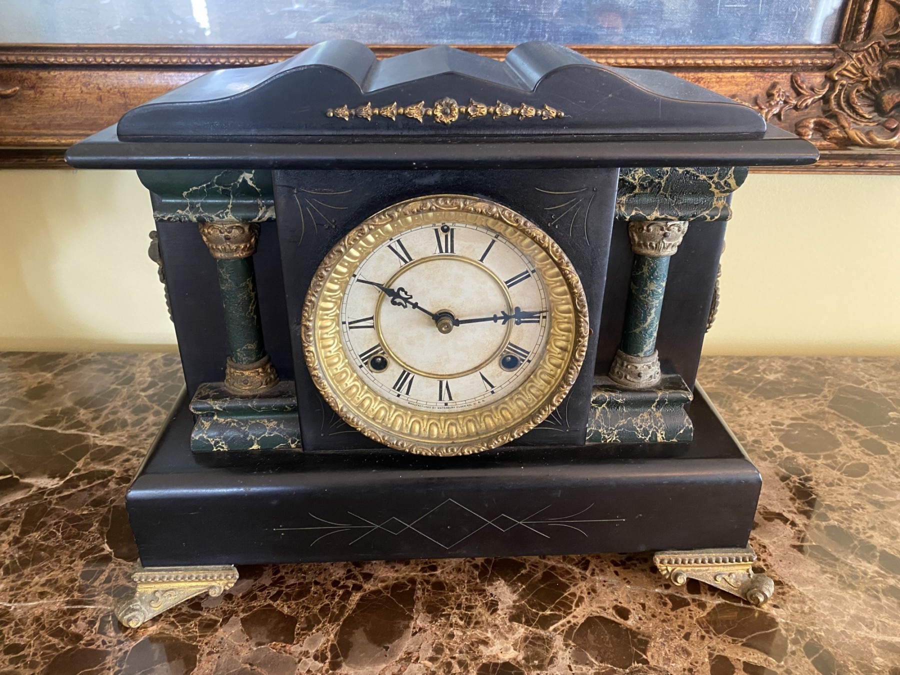 JM Selliken watchmaker and jeweler brooklyn NY. brass feet and decorative trim. with key. 14 x 151/2 x 12