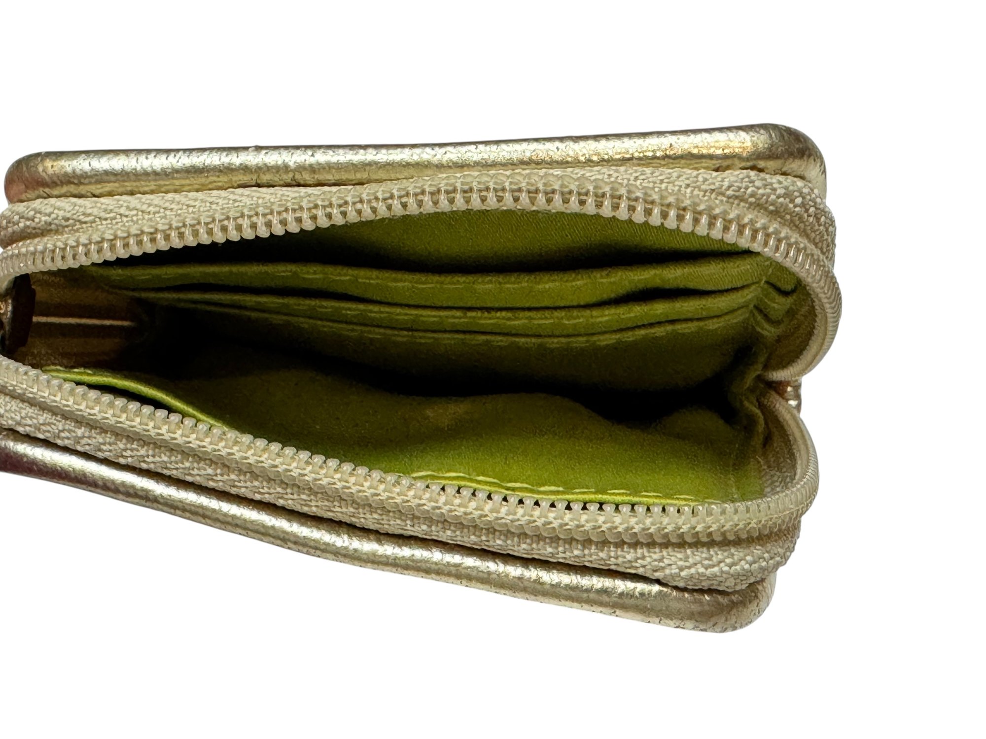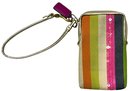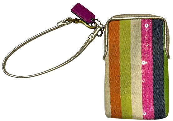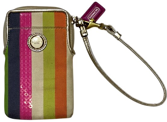 Coach poppy legacy stripe universal canvas vertical wristlet. Comes with one sided detachable wrist chain. Exterior front slip pocket. Zippered compartment opens up to multiple interior slots. Multicolored canvas print with clear sequins. Gold/platinum leather border. Note: Minor signs of use and wear.