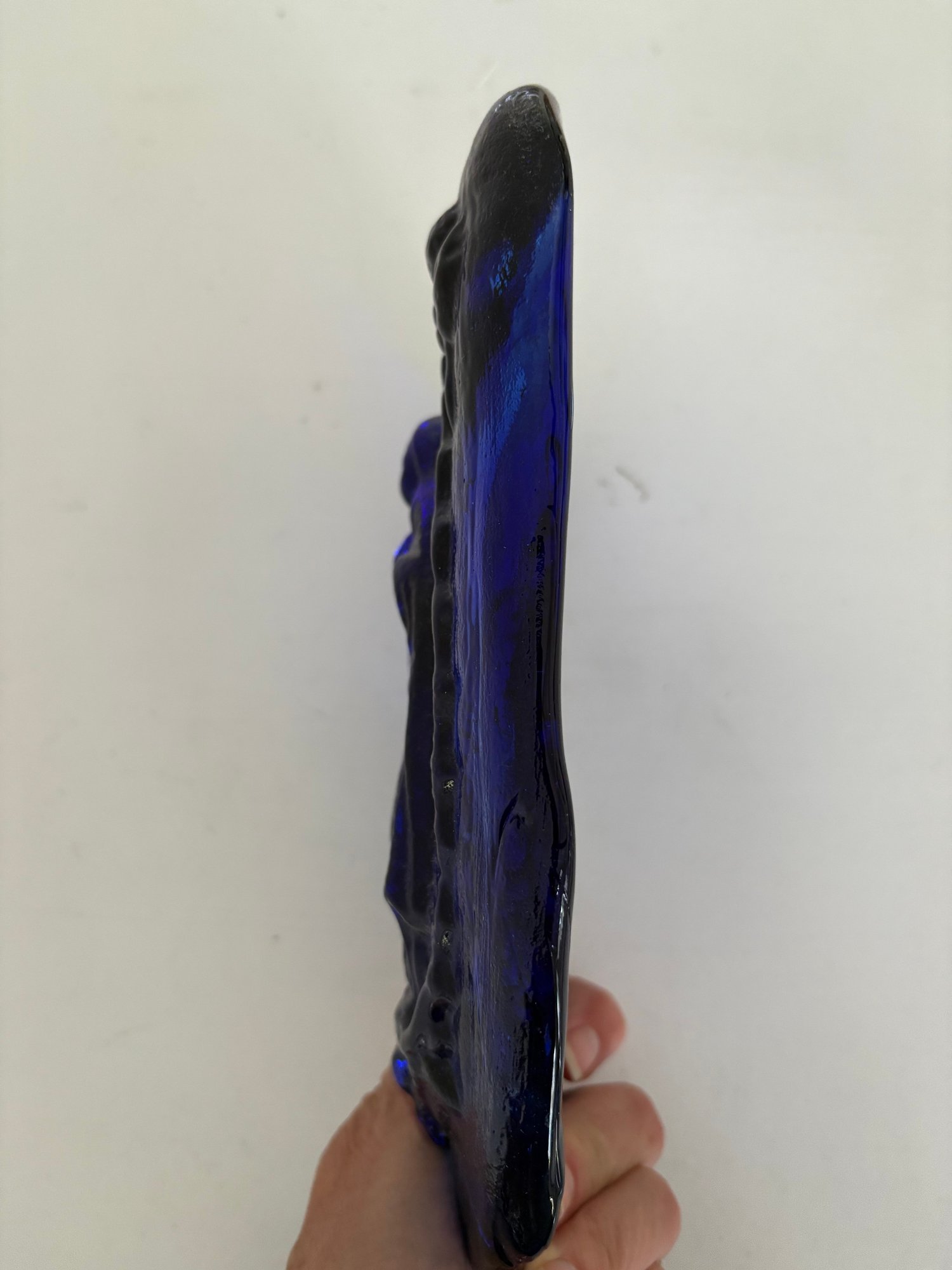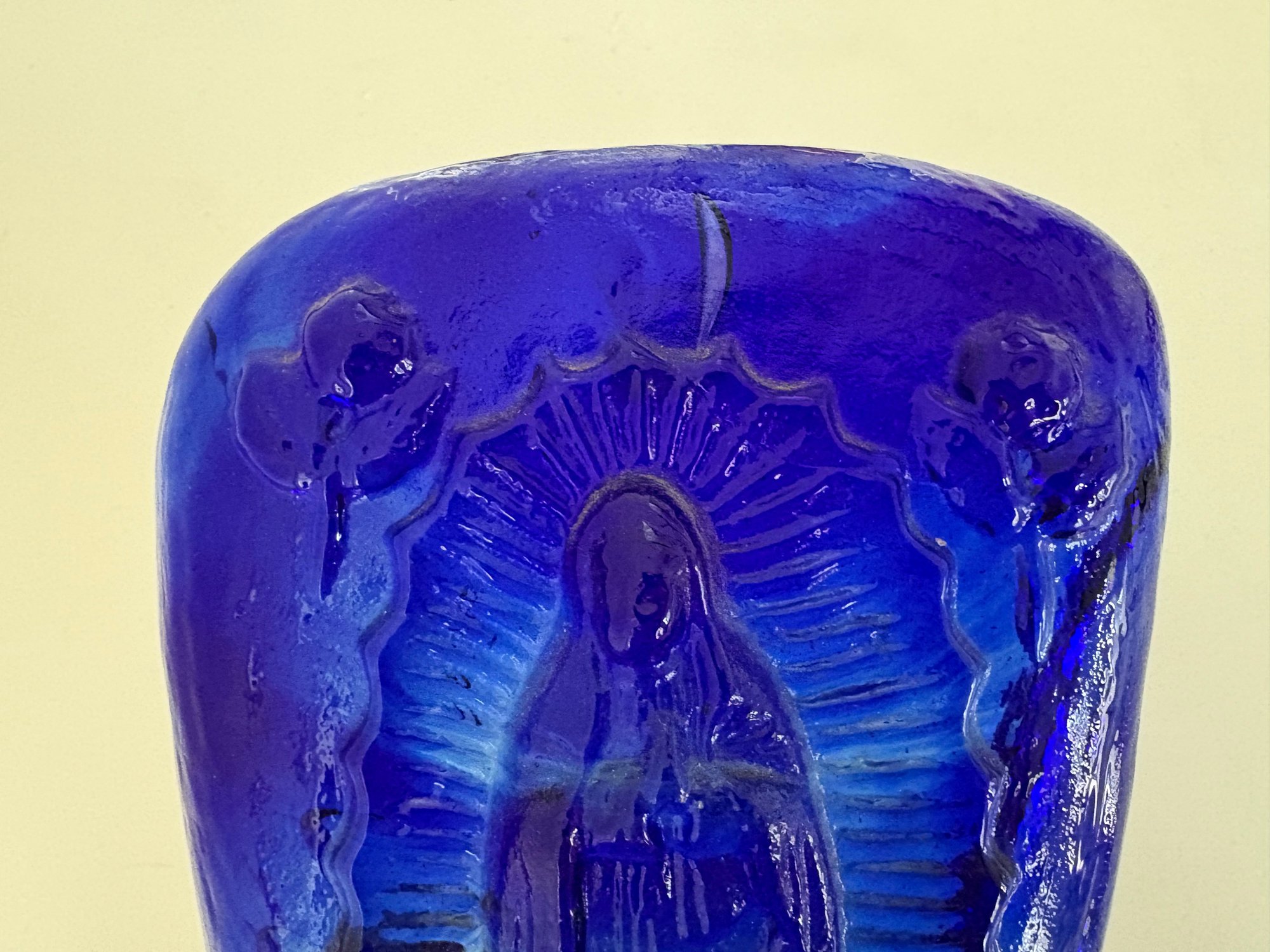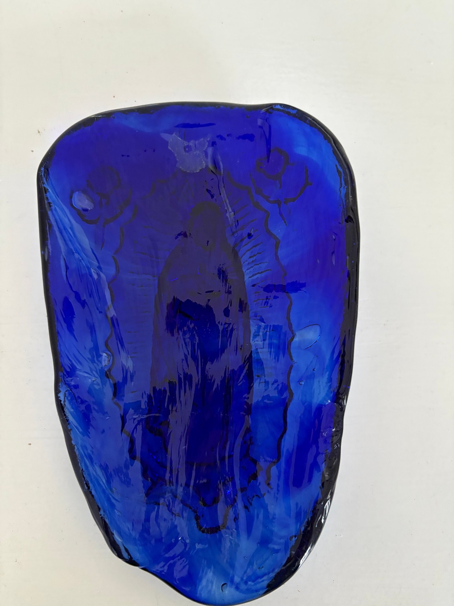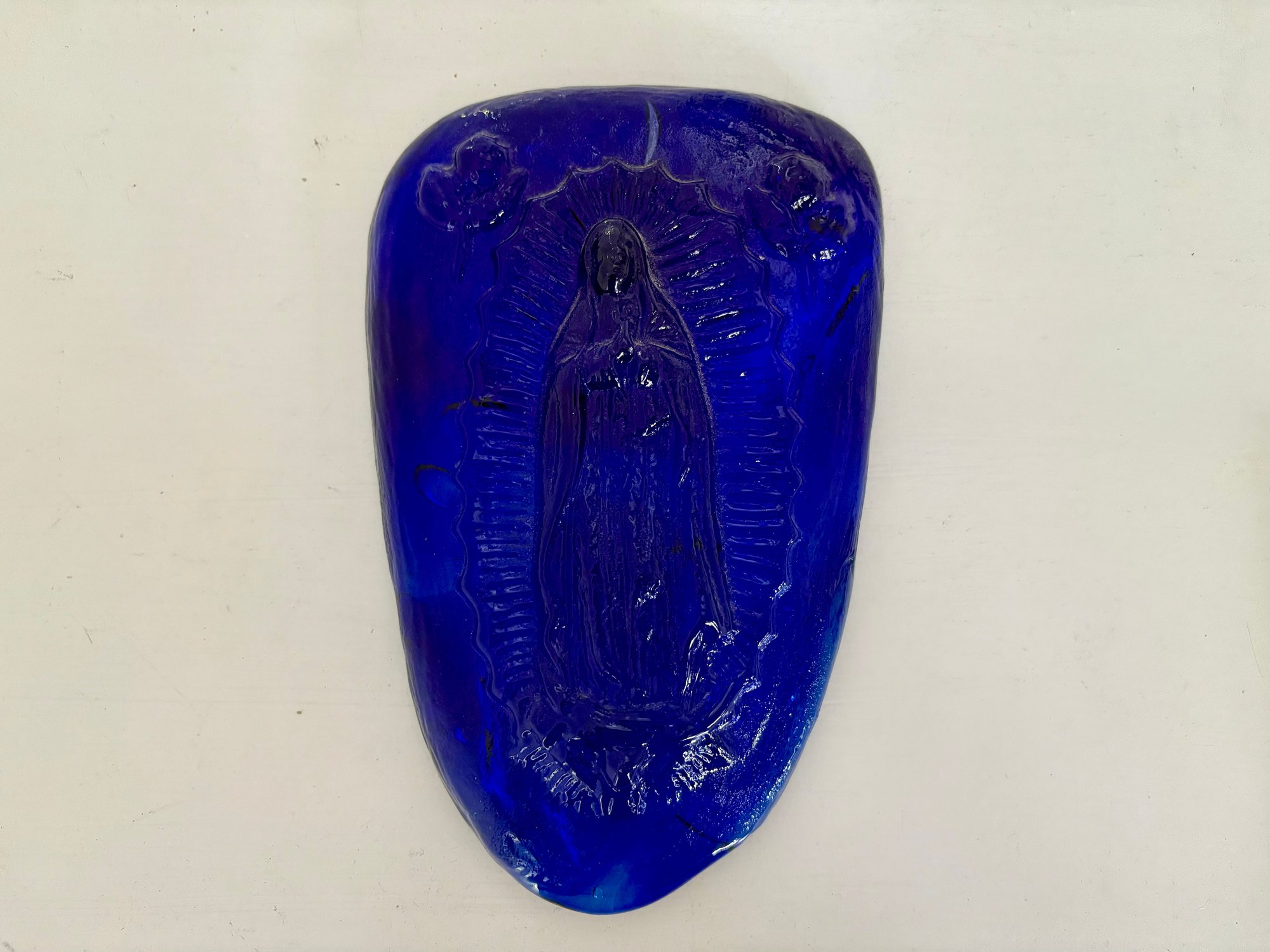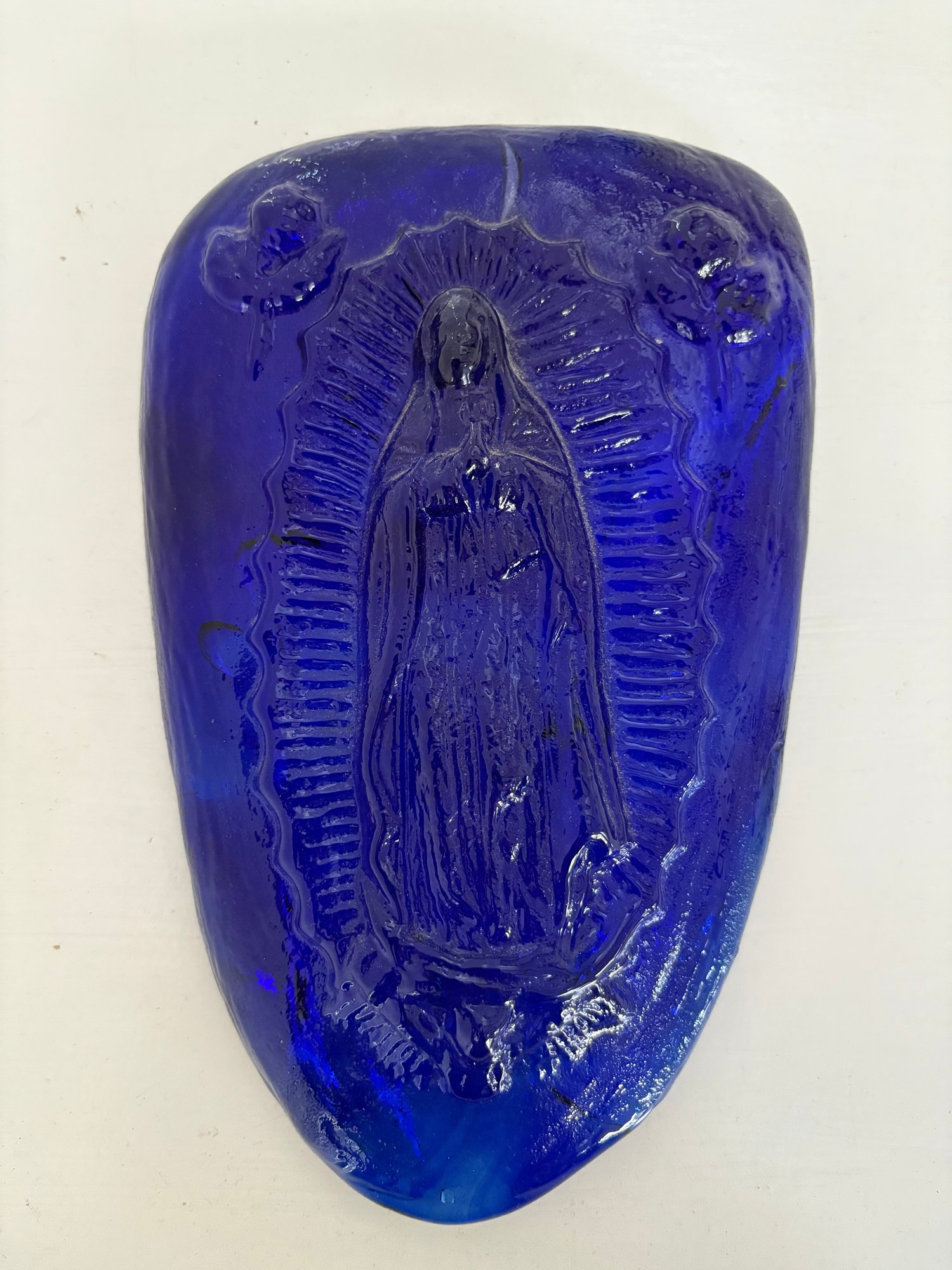 Cobalt blue glass Madonna wall hanging.