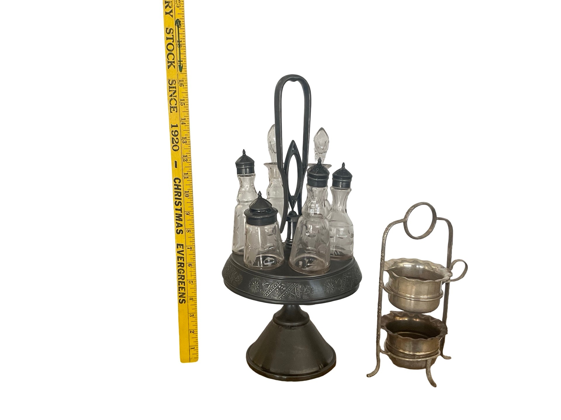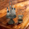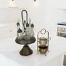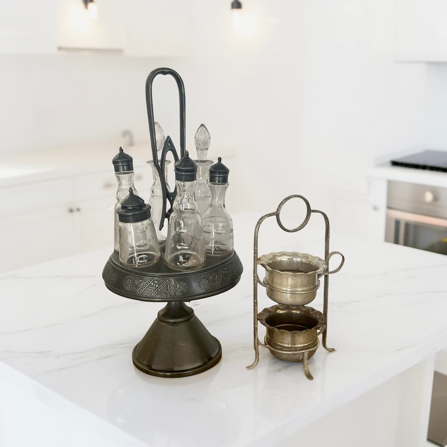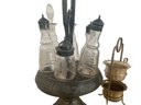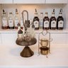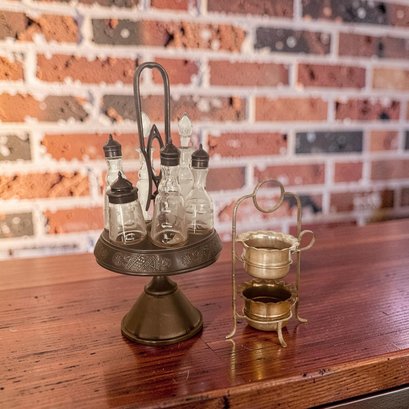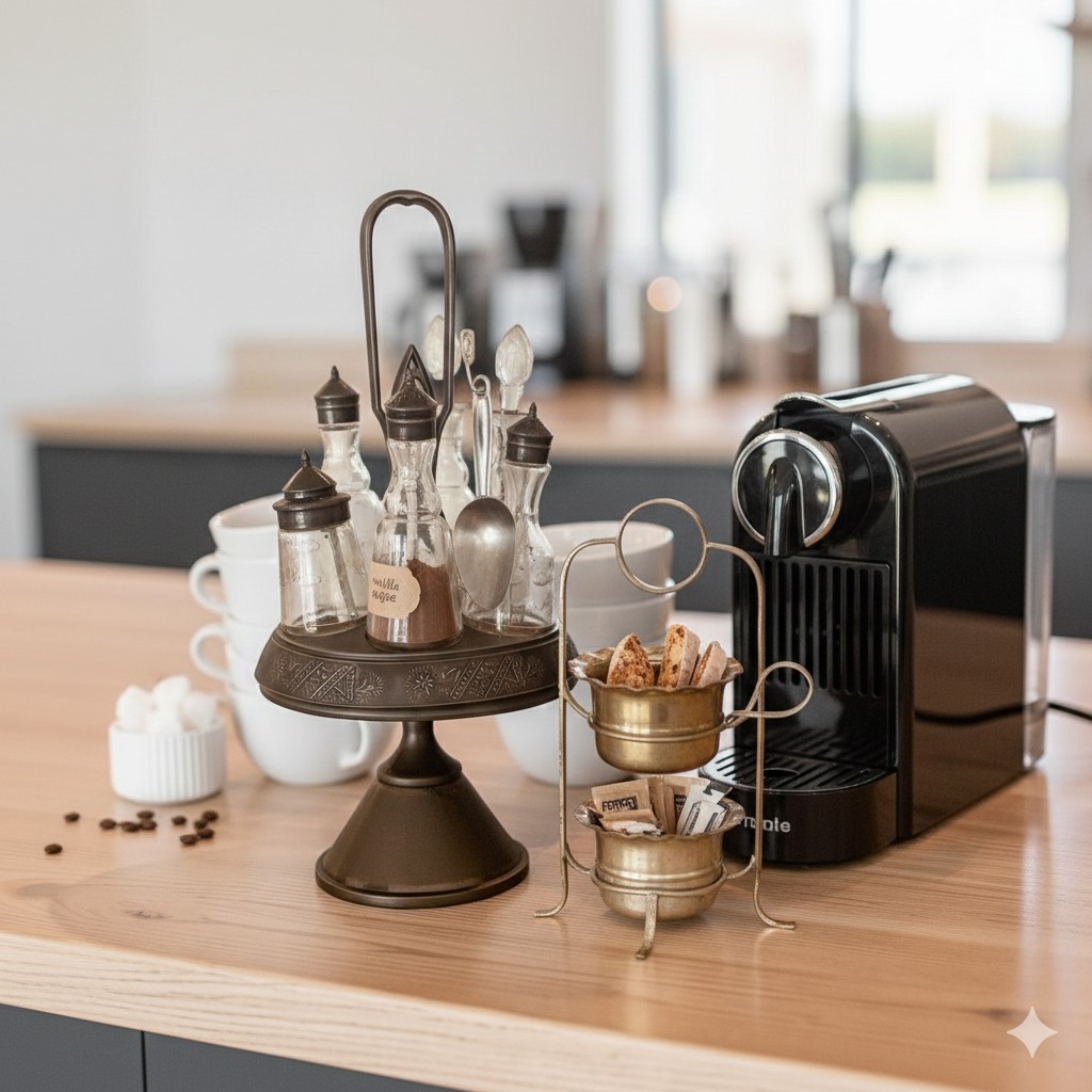 Elevate your morning ritual with this stunning vintage inspired coffee bar accessory set. NOTE Coffee pot and cups not included Add a touch of Old World café charm to your kitchen with this elegant antique bronze coffee service set. This duo includes a stunning pedestal caddy with six glass cruets—perfect for organizing espresso beans, flavored syrups, and spices—alongside a delicate two-tiered brass stand for sugar packets or biscotti. Finished in a rich antiqued patina, it is the ultimate functional centerpiece for any home espresso bar or brunch table.