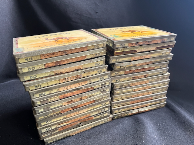 Amazing collection of cancelled postage stamps in collectable Camel Cigarette tins! Please contact Auction Manager for more or specific photos. SHIPPING AVAILABLE for this item!