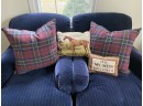 Two square with red, navy, yellow and green plaid; one needlepoint decorative pillow with horse scene; one small with saying "It's My Mess And I Love It."