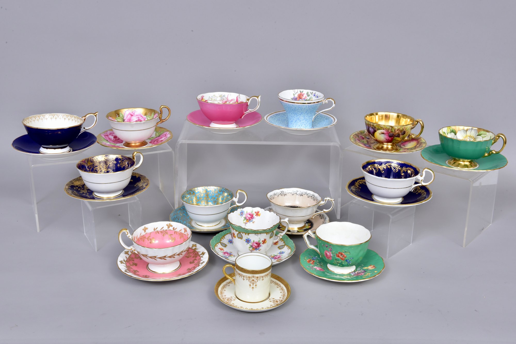 Includes 13 tea cup sets and 1 demitasse set.
