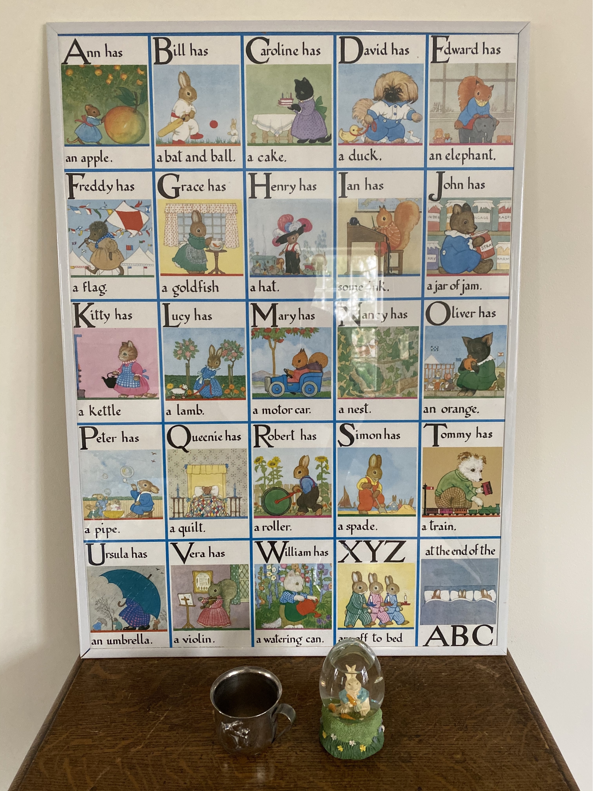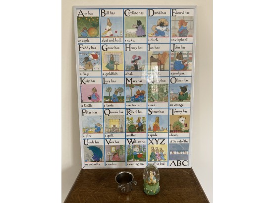 Framed ABC print measuring 20x28, silver Peter Rabbit teacup, and bunny snow globe.