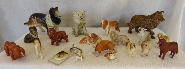 If the Collie is your favorite dog, this cute collection of figurines will surely please. Ranging from ceramic to molded rubber (far right rear) to plastic they're all vintage to some degree. Even includes a key-chain. The largest ceramic one has been glued, but tough to tell it will blend right in, rest seem to be ok.