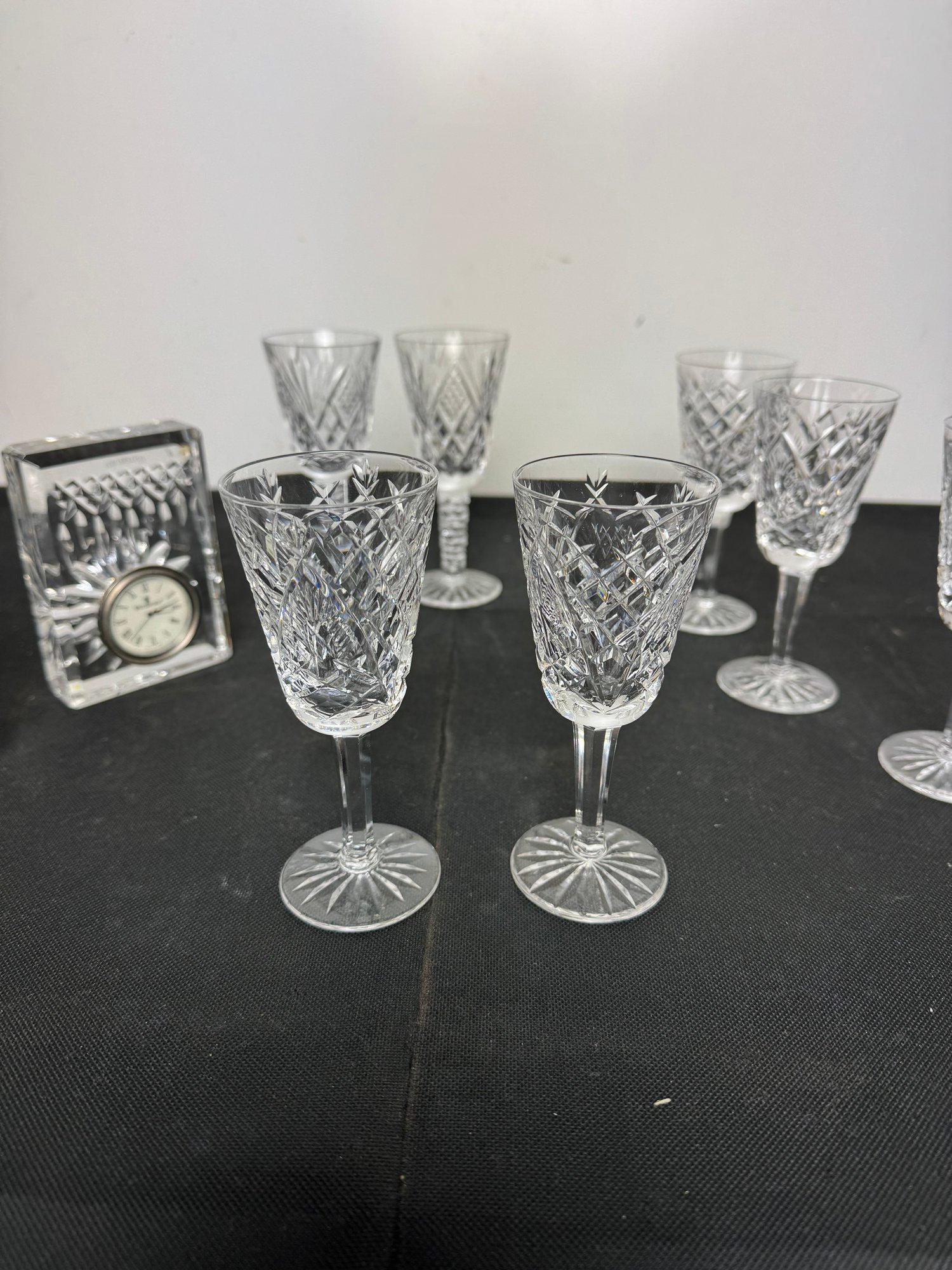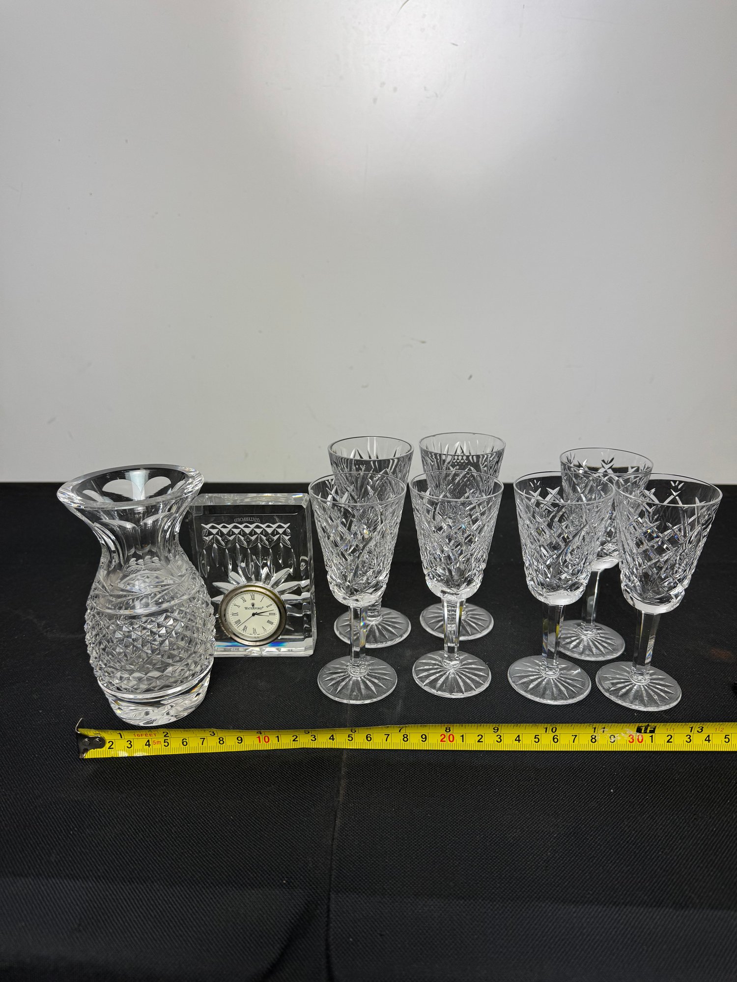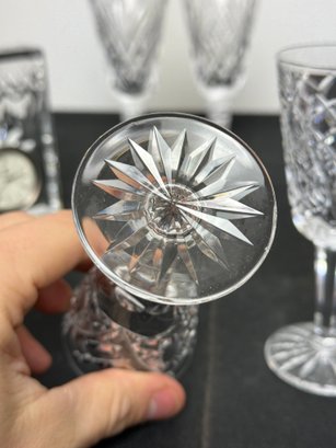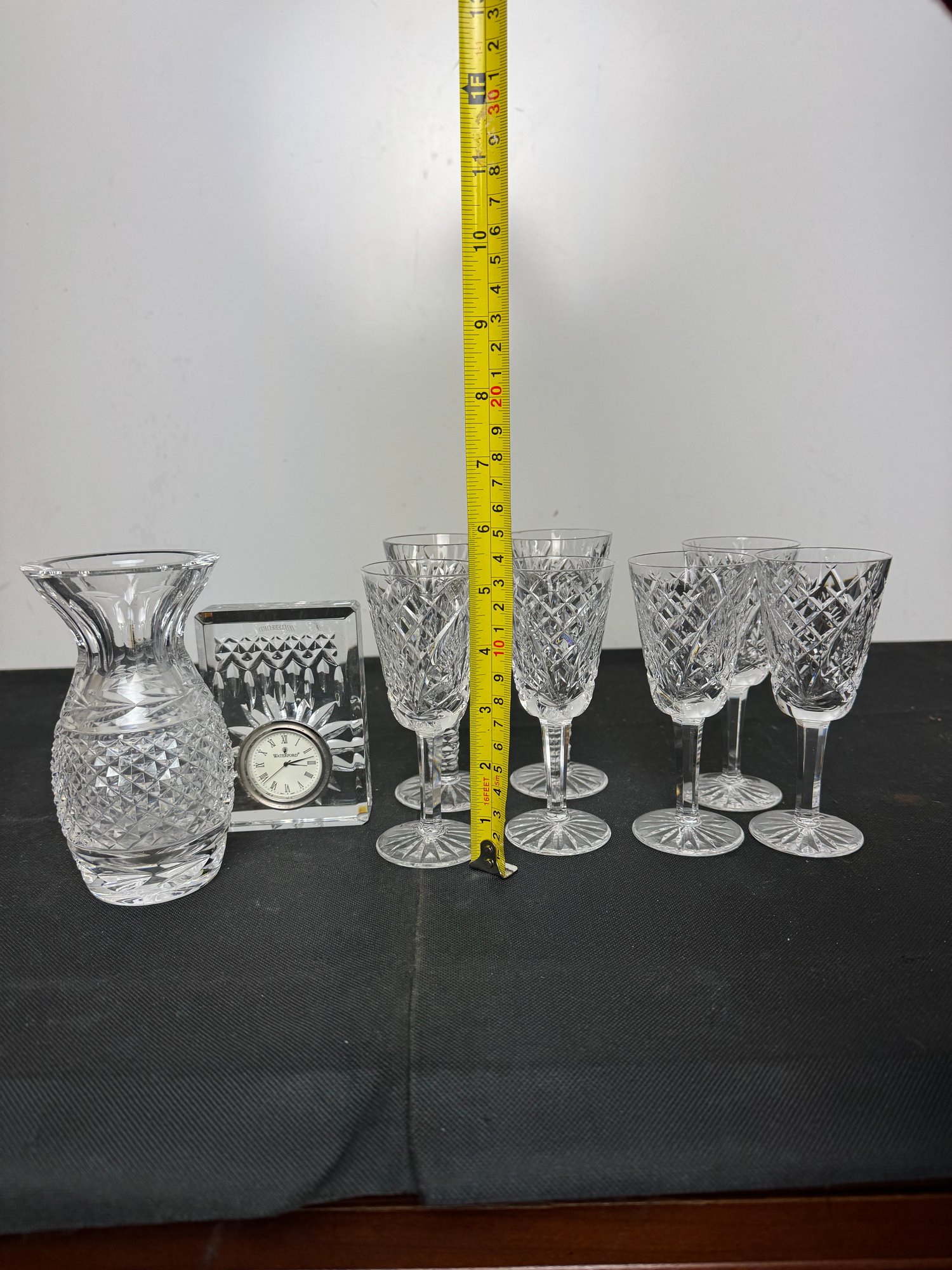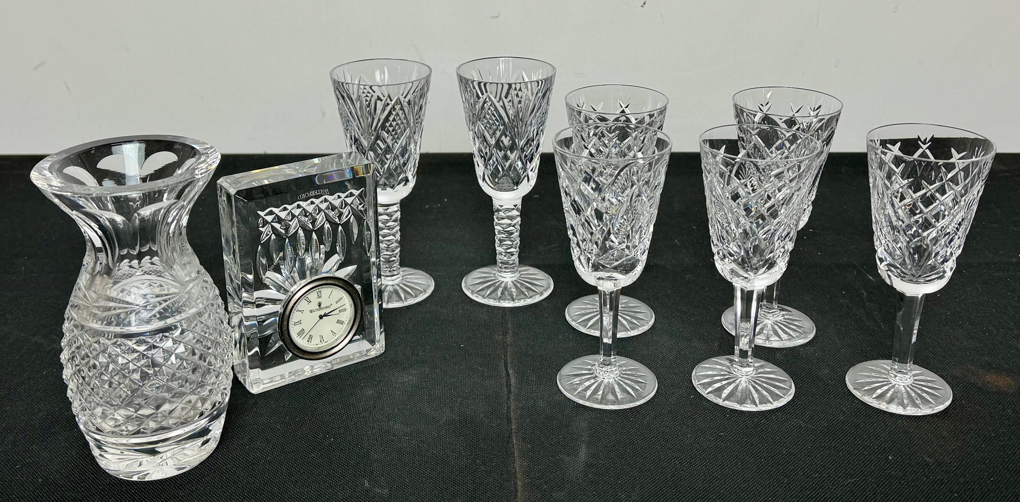 The vase, clock and two of the are marked. Two other goblets are marked what appears to be royal Irish Waterford city. Showing a few signs of wear and tear but overall pretty good.