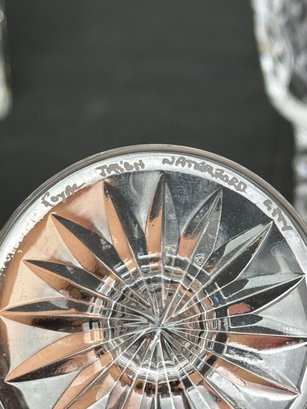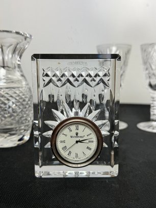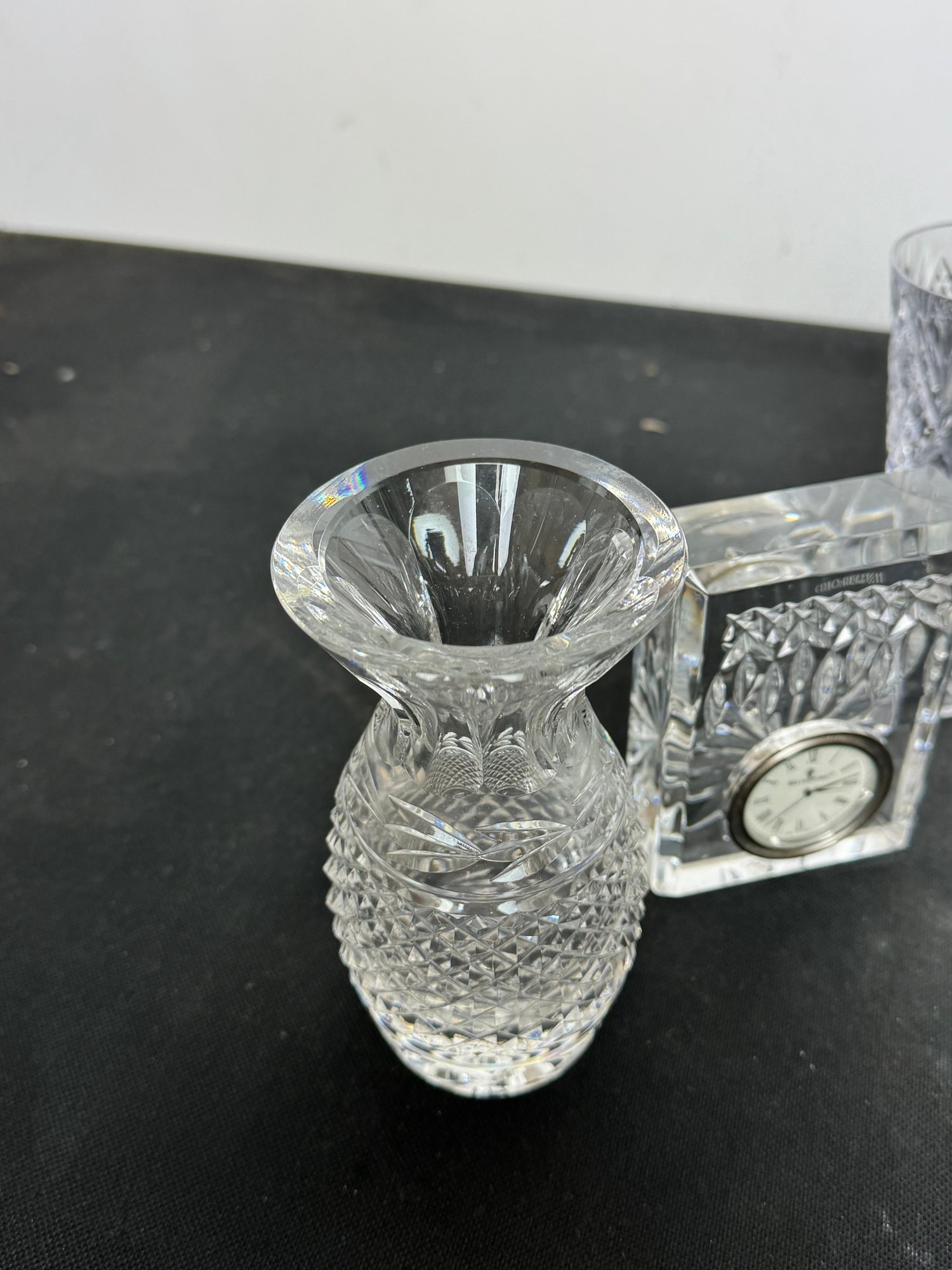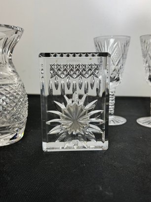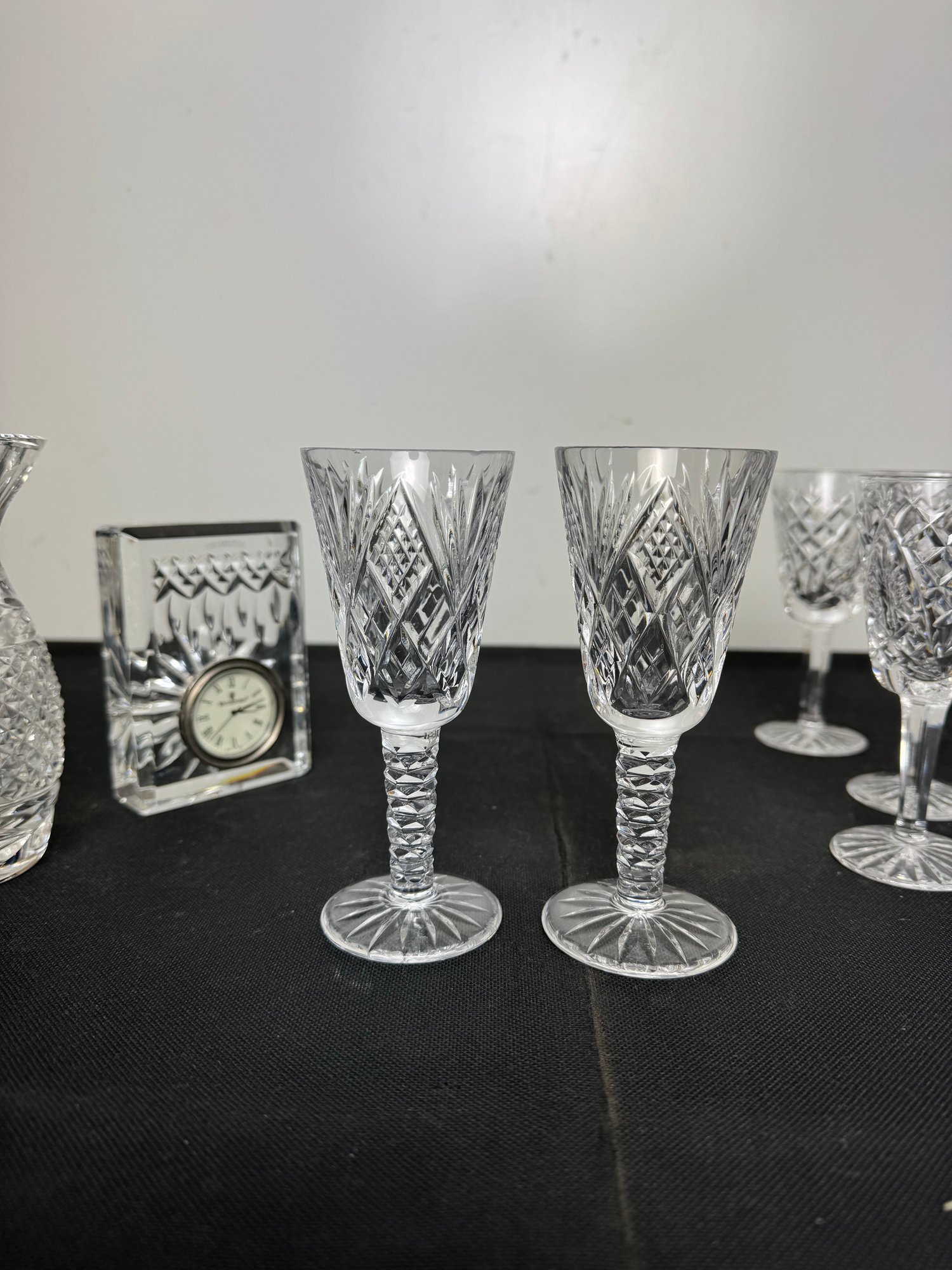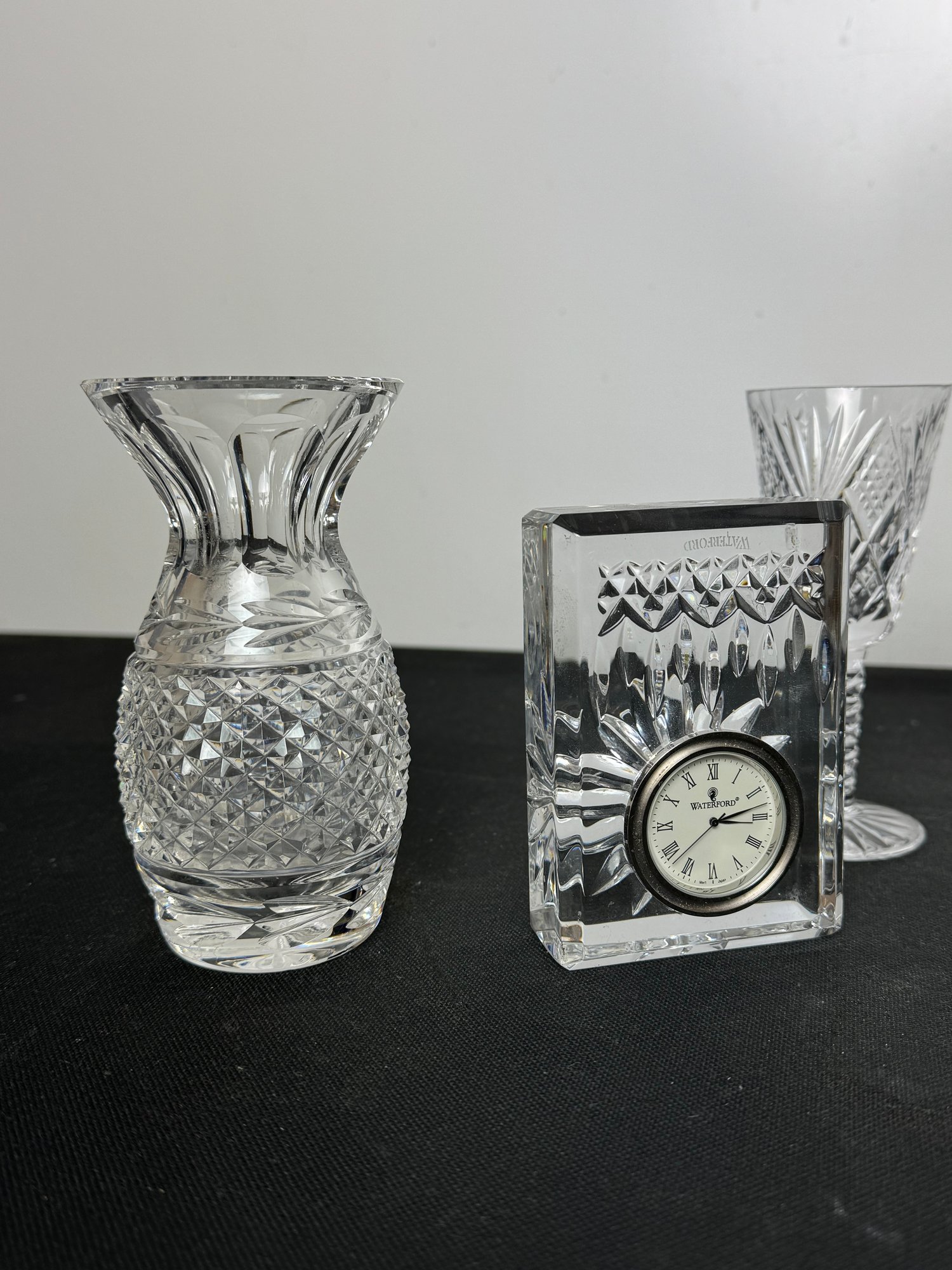The vase, clock and two of the are marked. Two other goblets are marked what appears to be royal Irish Waterford city. Showing a few signs of wear and tear but overall pretty good.