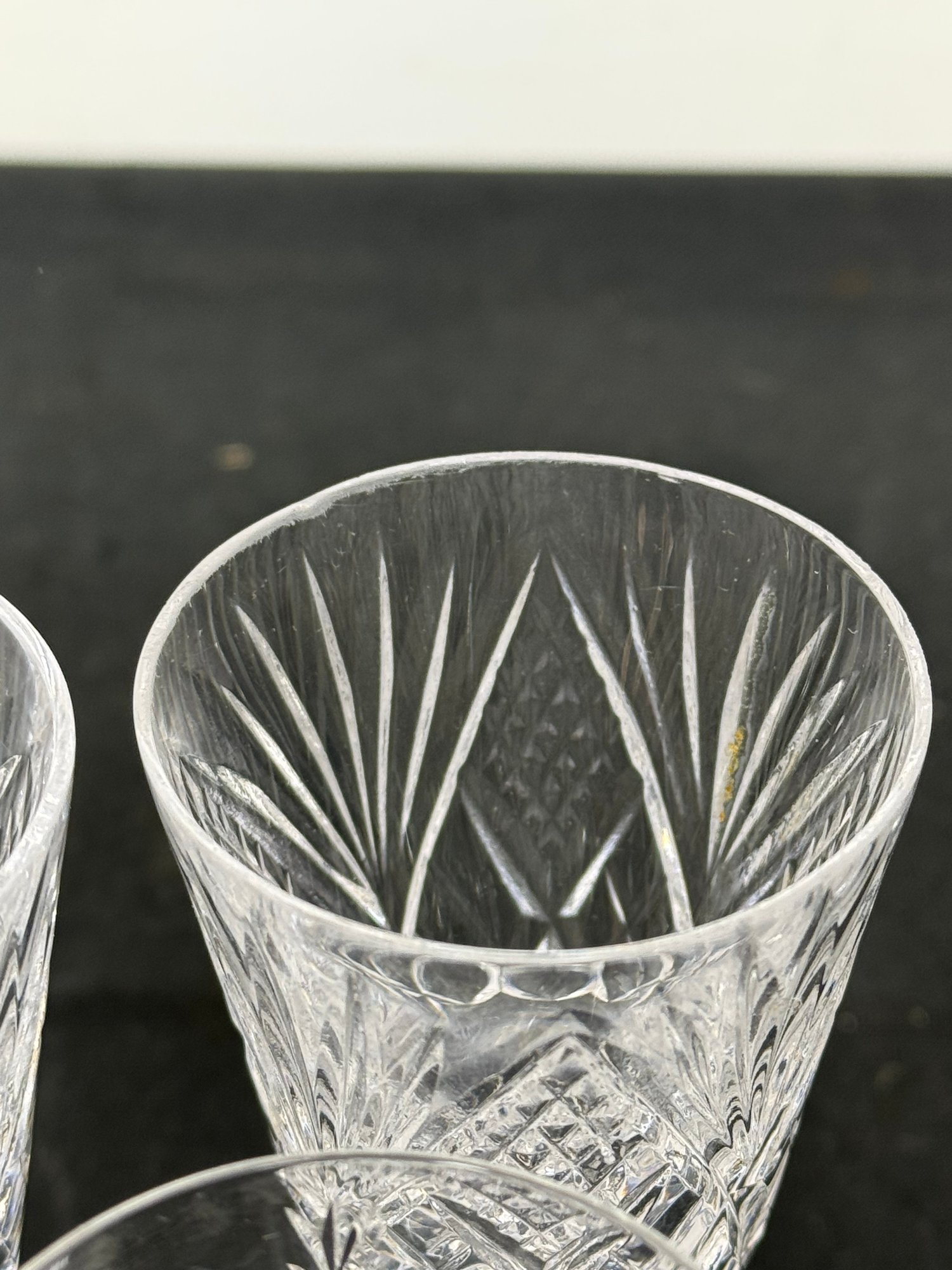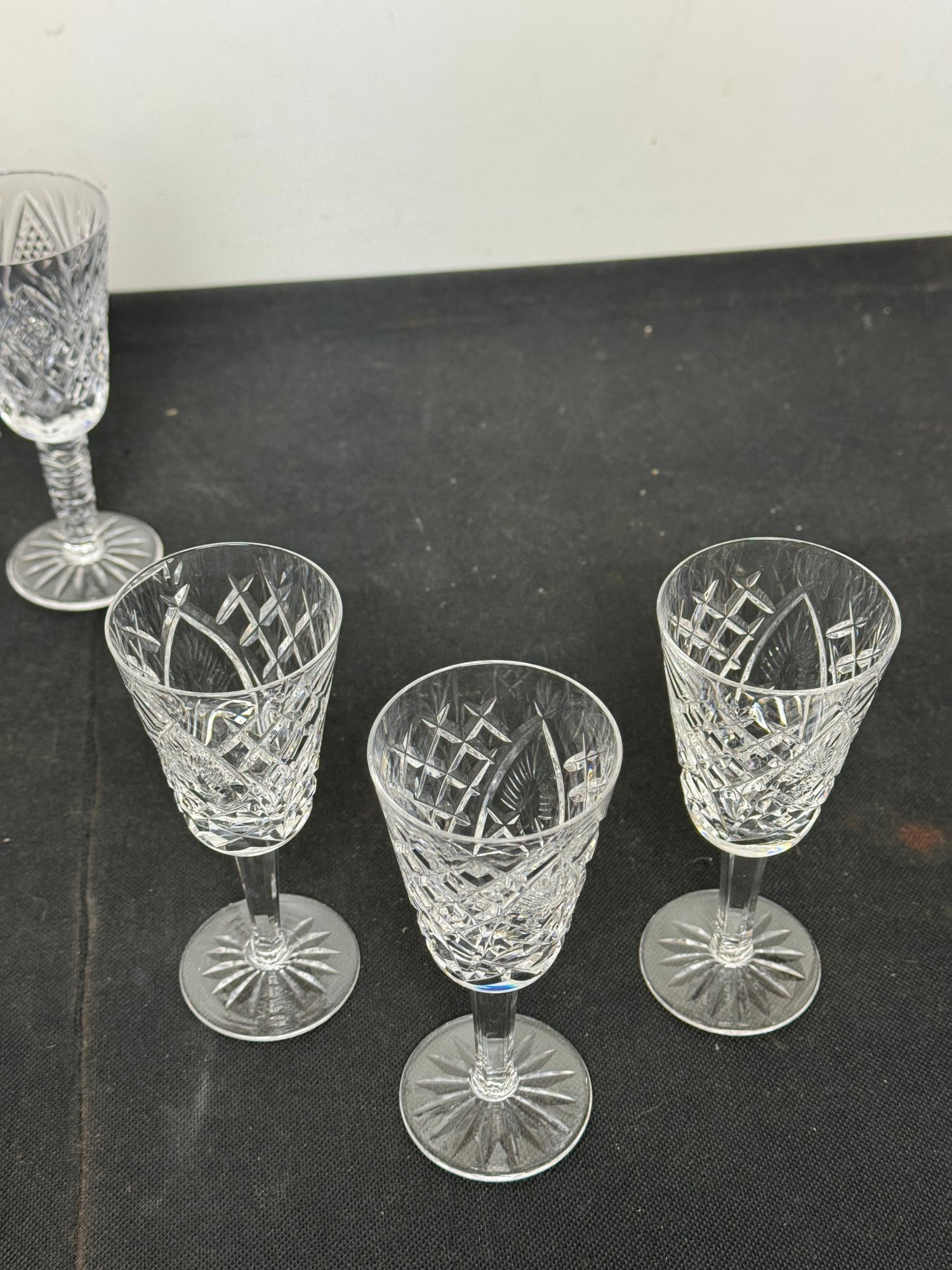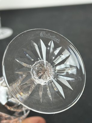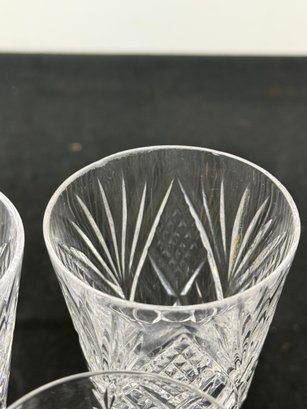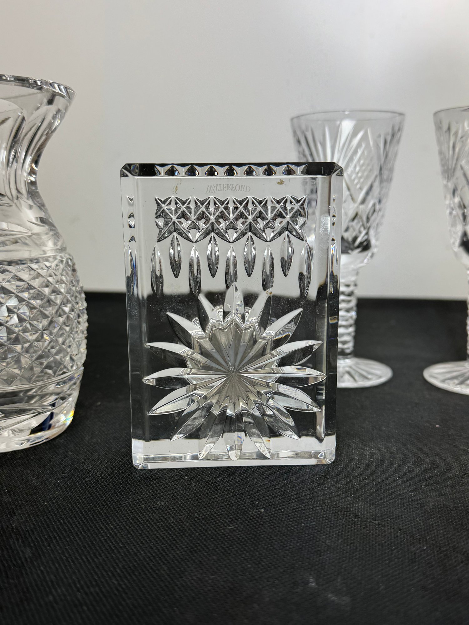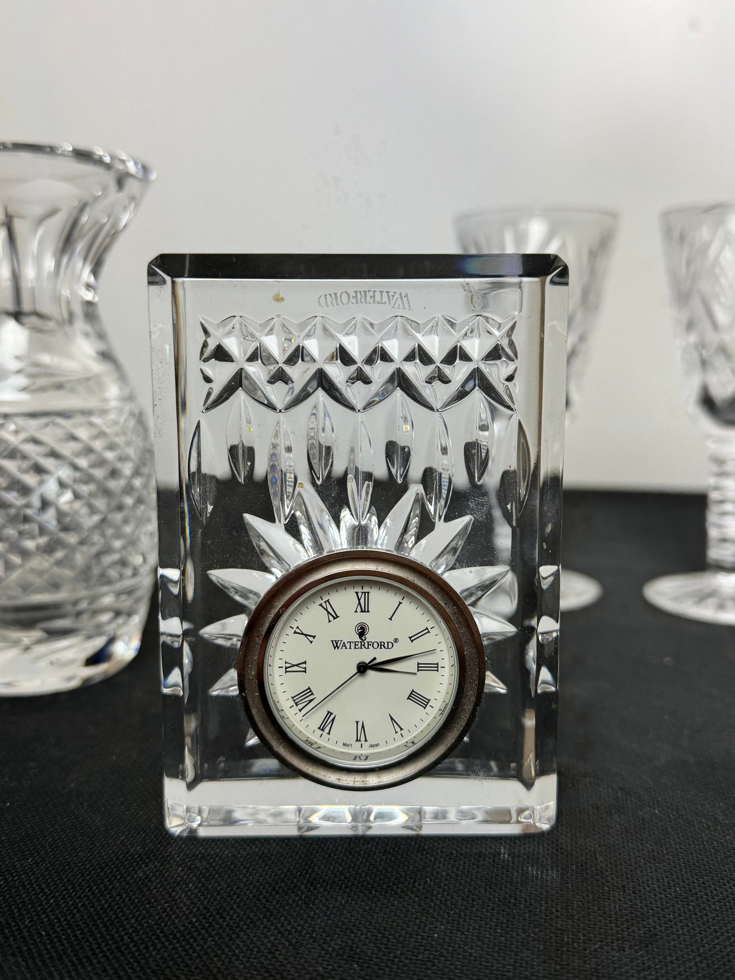 The vase, clock and two of the are marked. Two other goblets are marked what appears to be royal Irish Waterford city. Showing a few signs of wear and tear but overall pretty good.