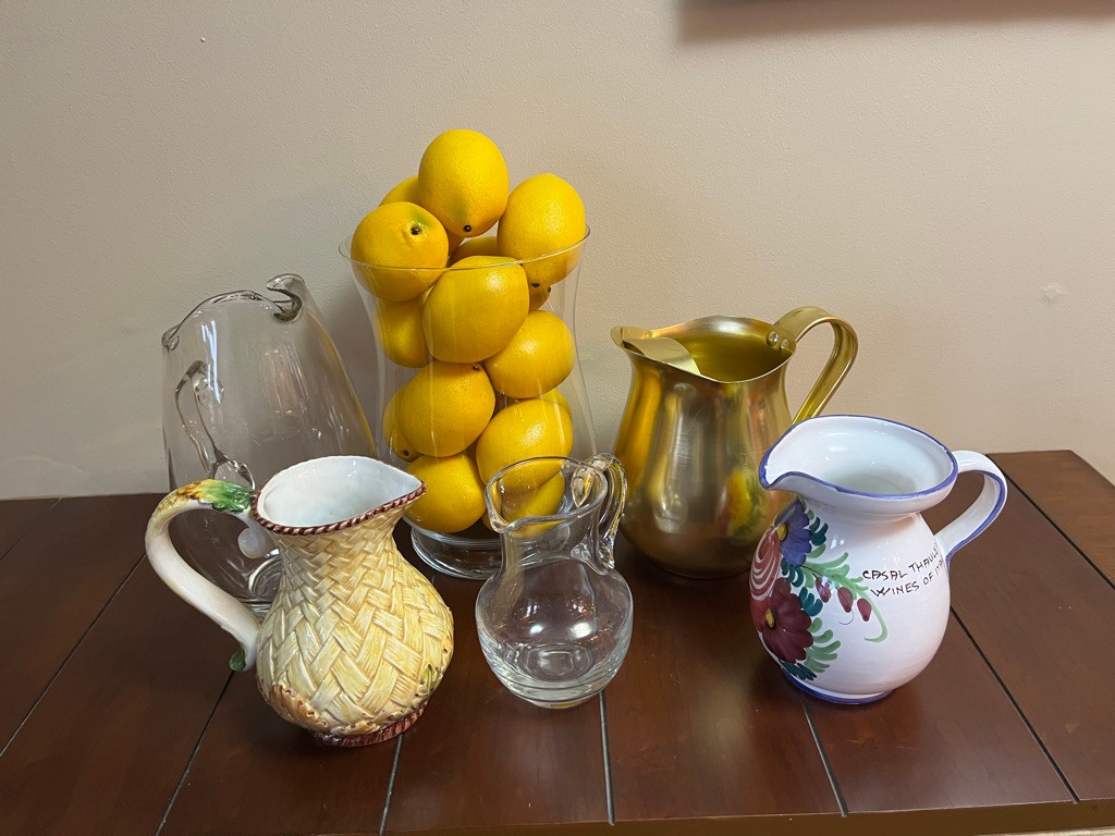 2 glass pitchers, 2 Italian ceramic pitchers, one gold metal pitcher and one glass vase with all the lemons