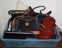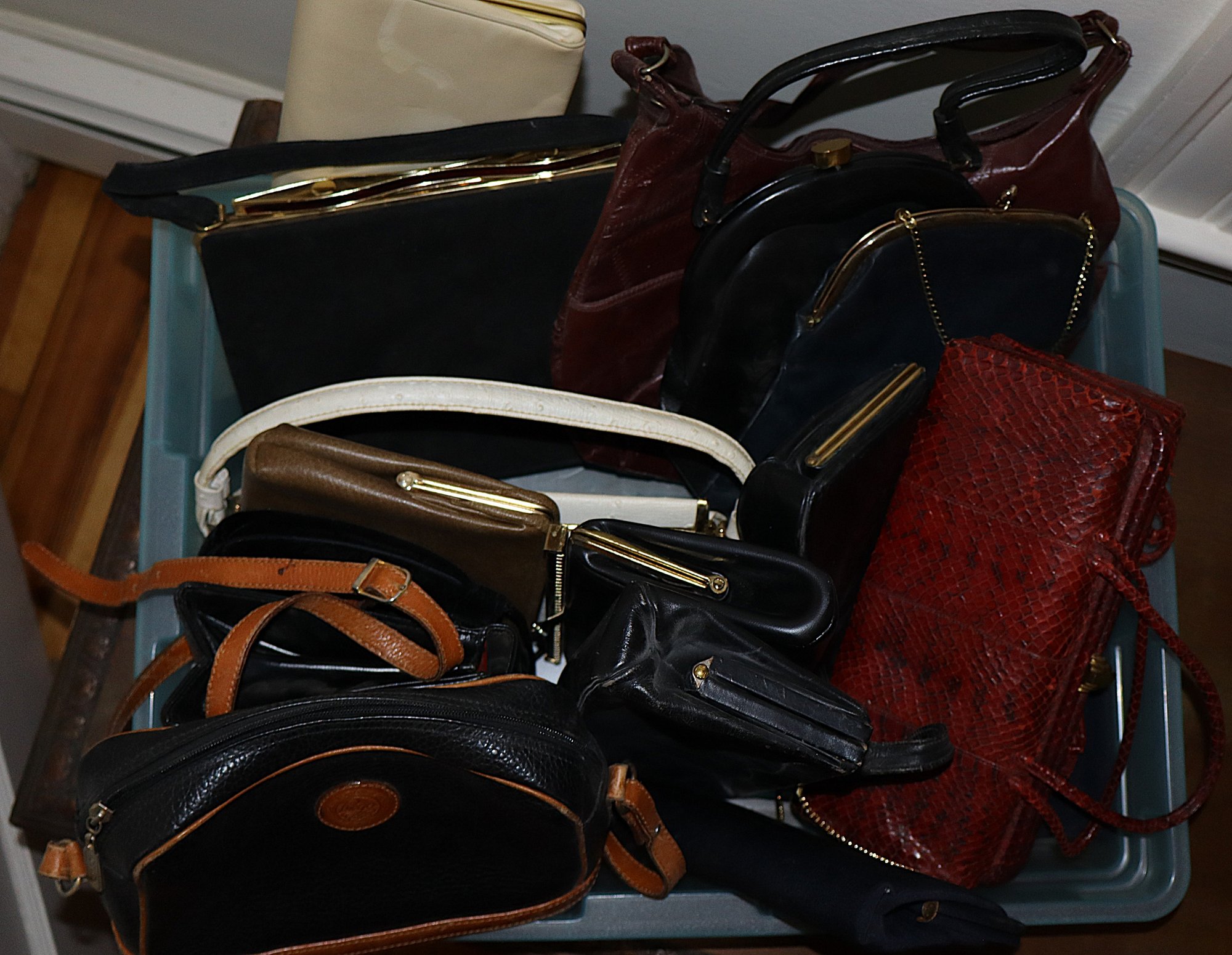 Collection of vintage handbags in various styles & materials; plastic bin included