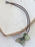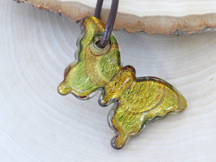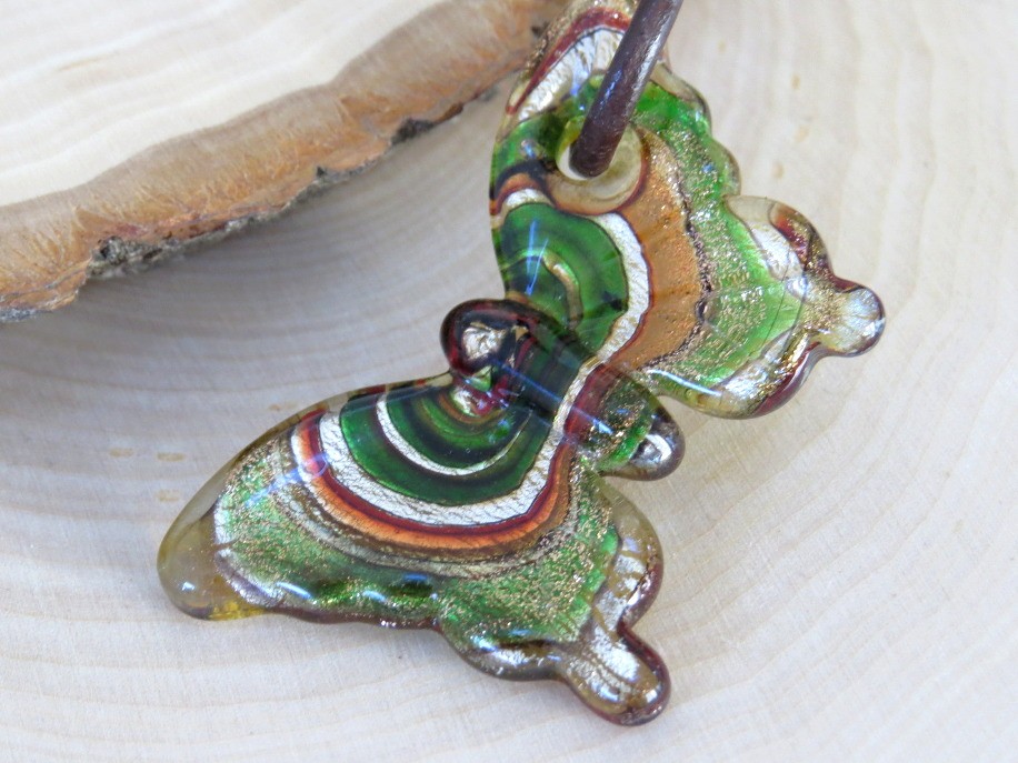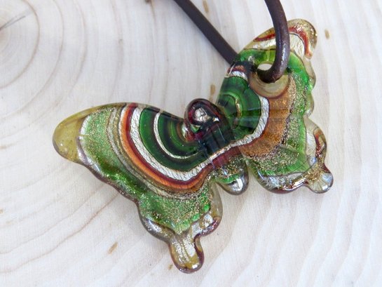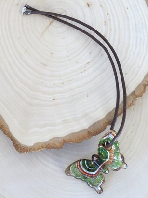 Lovely glass butterfly pendant in shades of green, orange, light amber and more. Butterfly pendant is on a 18" cord which has a working lobster claw clasp. Clasp end is marked 925. Butterfly measures 2 3/8" X 1 1/2". Appears to have no cracks or chips.