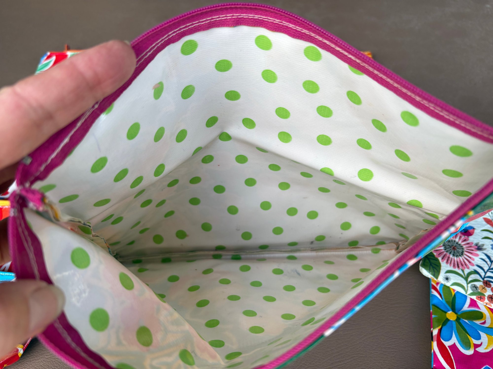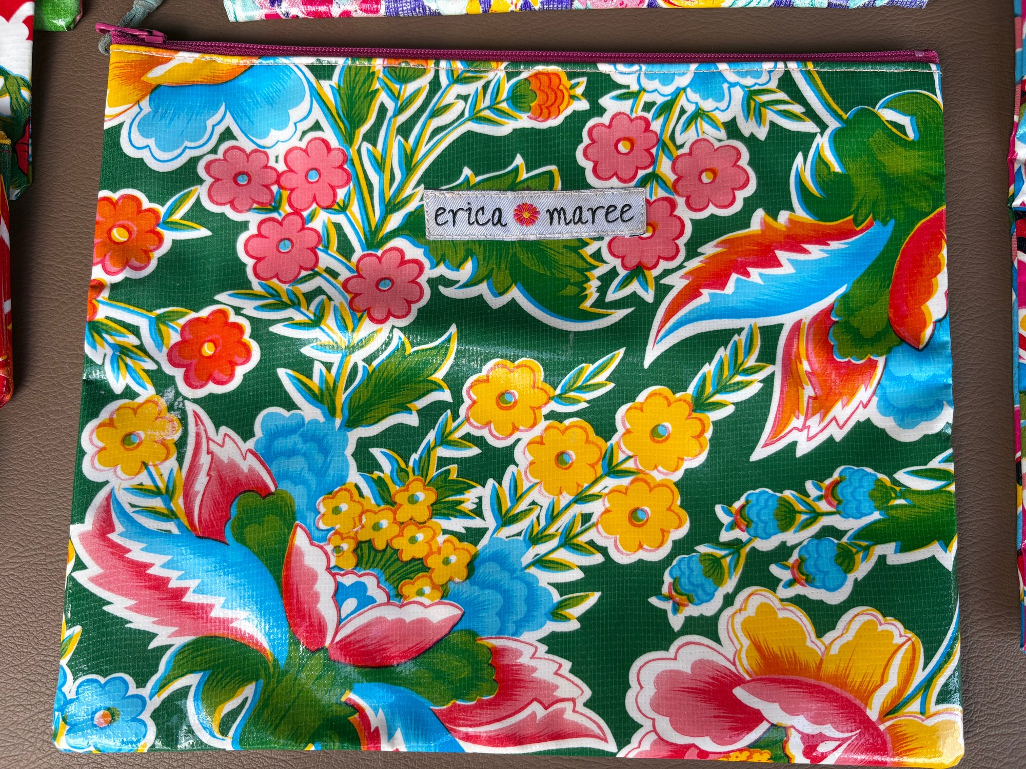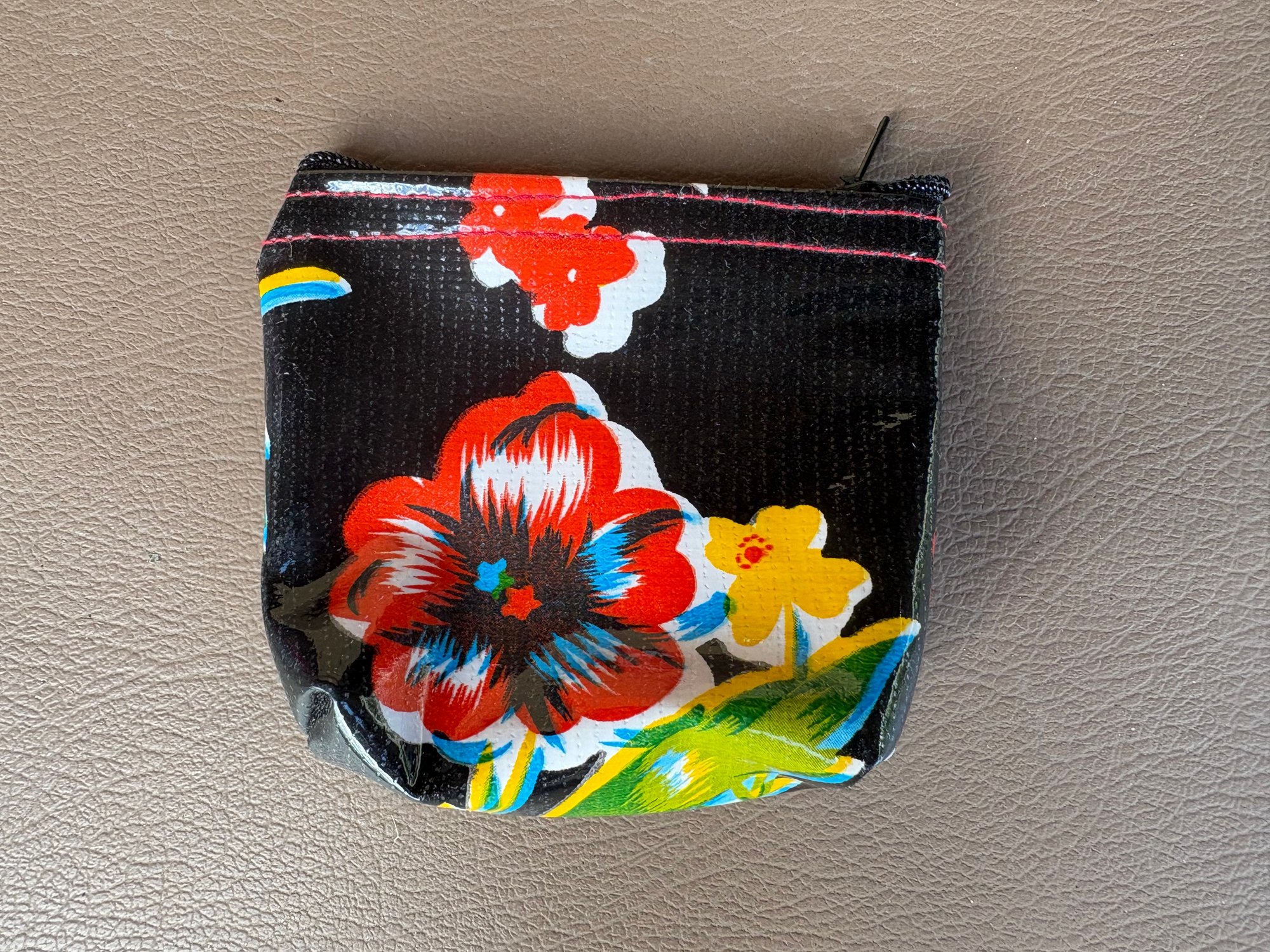 Collection of colorful small zippered pouches made from oilcloth and post-consumer materials.