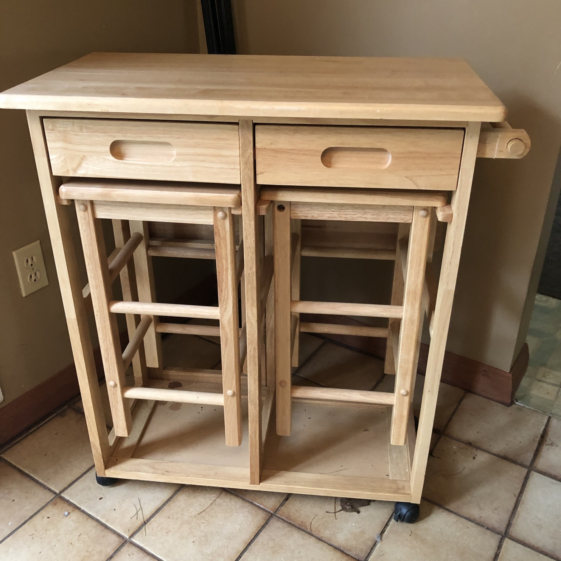 Compact Wood Kitchen Cart With Stools. Work surface with a drop leaf. Rack for a dish towel, two drawers and self-storing stools. Measures 33"x28"x16". Leaf adds an additional 14.5" of workspace length. Good condition.