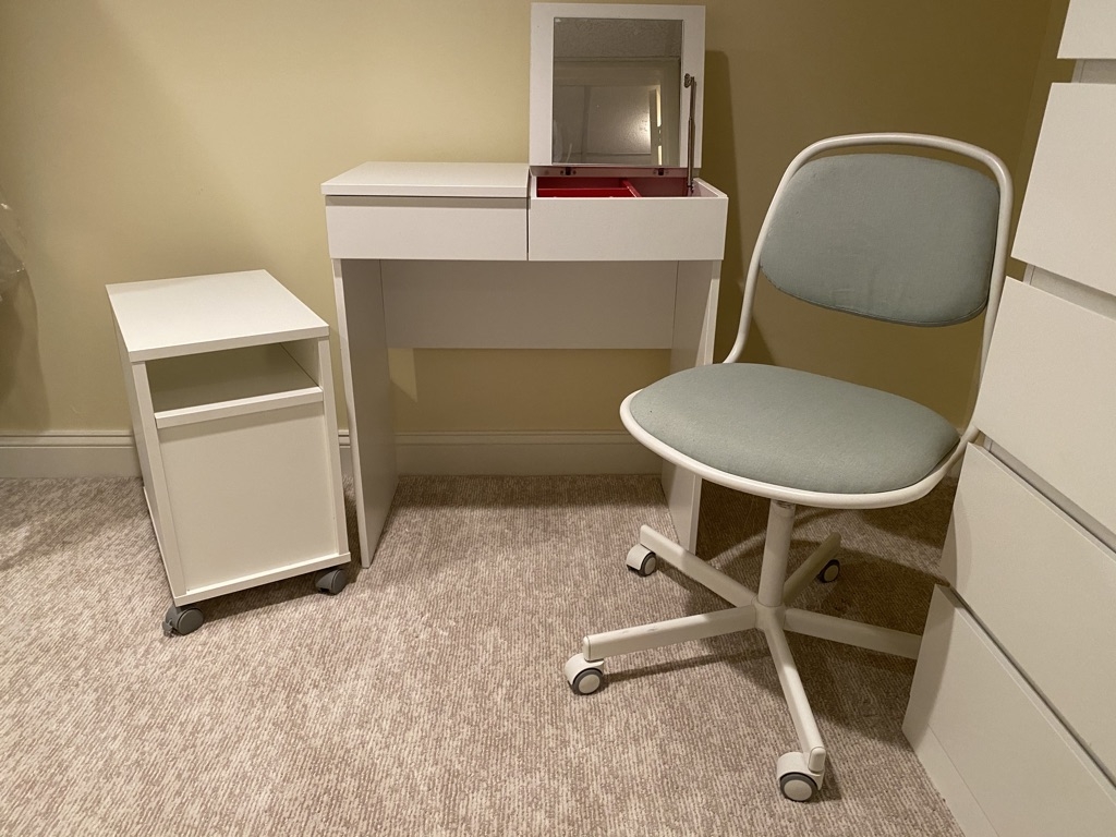 Desk measures 16.5 x 27.5 x 30.5. Side table/cabinet measures 19.5 x 12.5 x 21. Desk has top that lifts up to reveal organizational compartments. Small table and chair each have wheels.