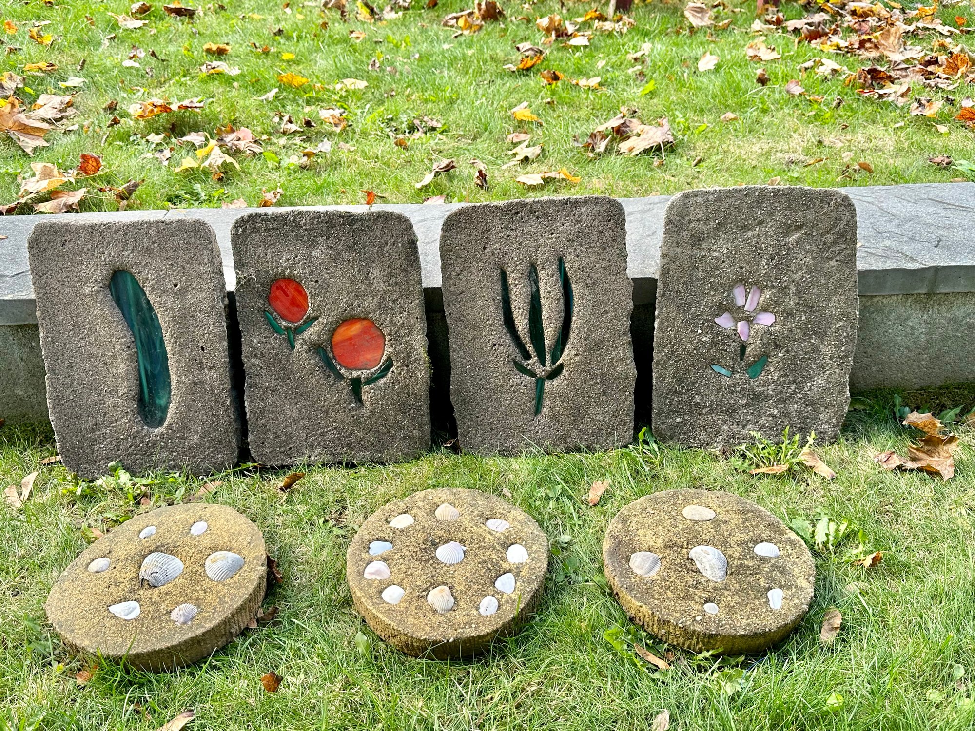 Concrete Stained Glass & Shell Garden Markers, So Creative! They can be put in your garden as markers or used as other decor.
