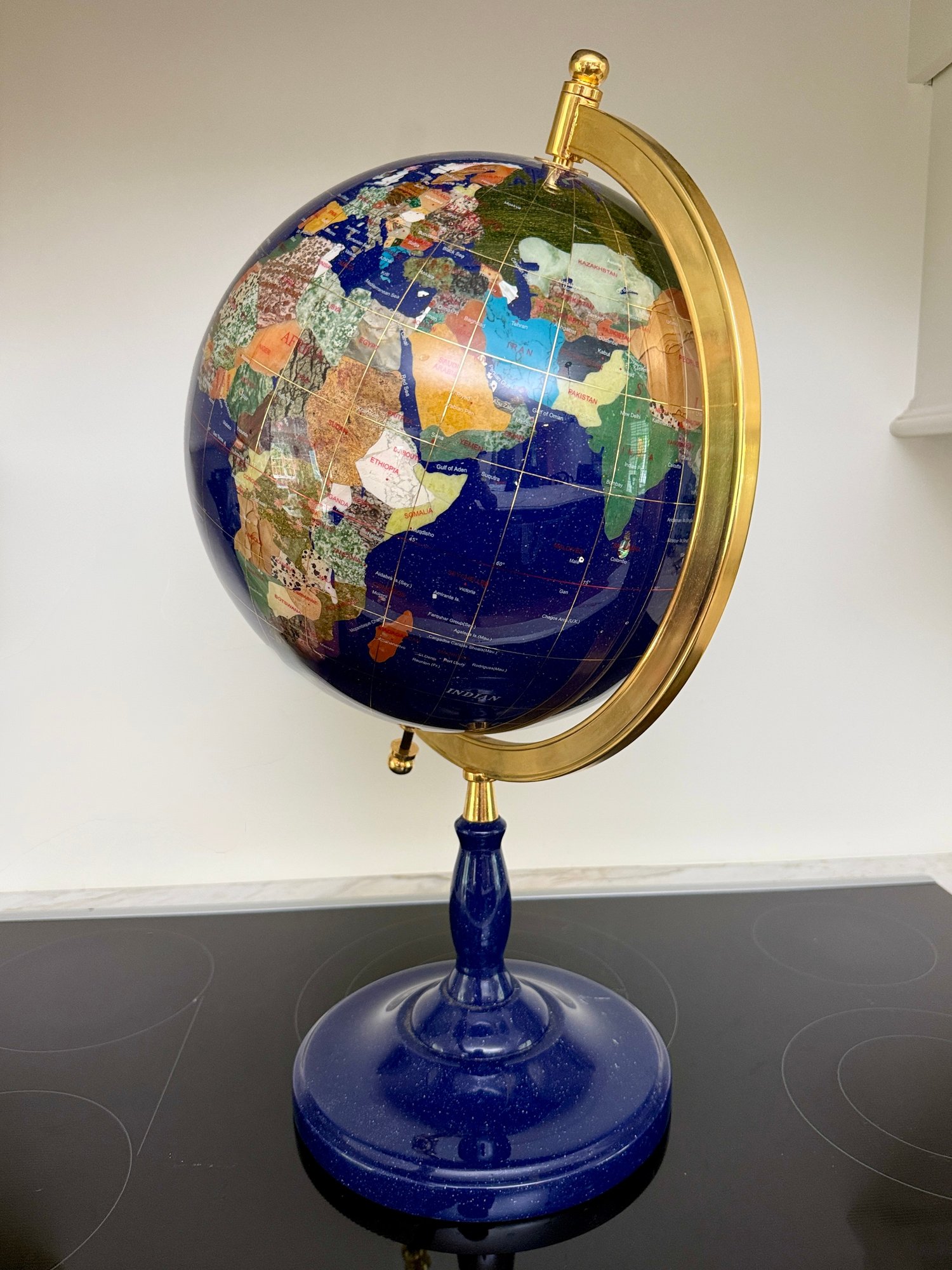Faux lapis lazuli ground inlaid with mother of pearl and semiprecious stones, gilt wire parallels and meridians; gilt brass meridians and lapis finish base.