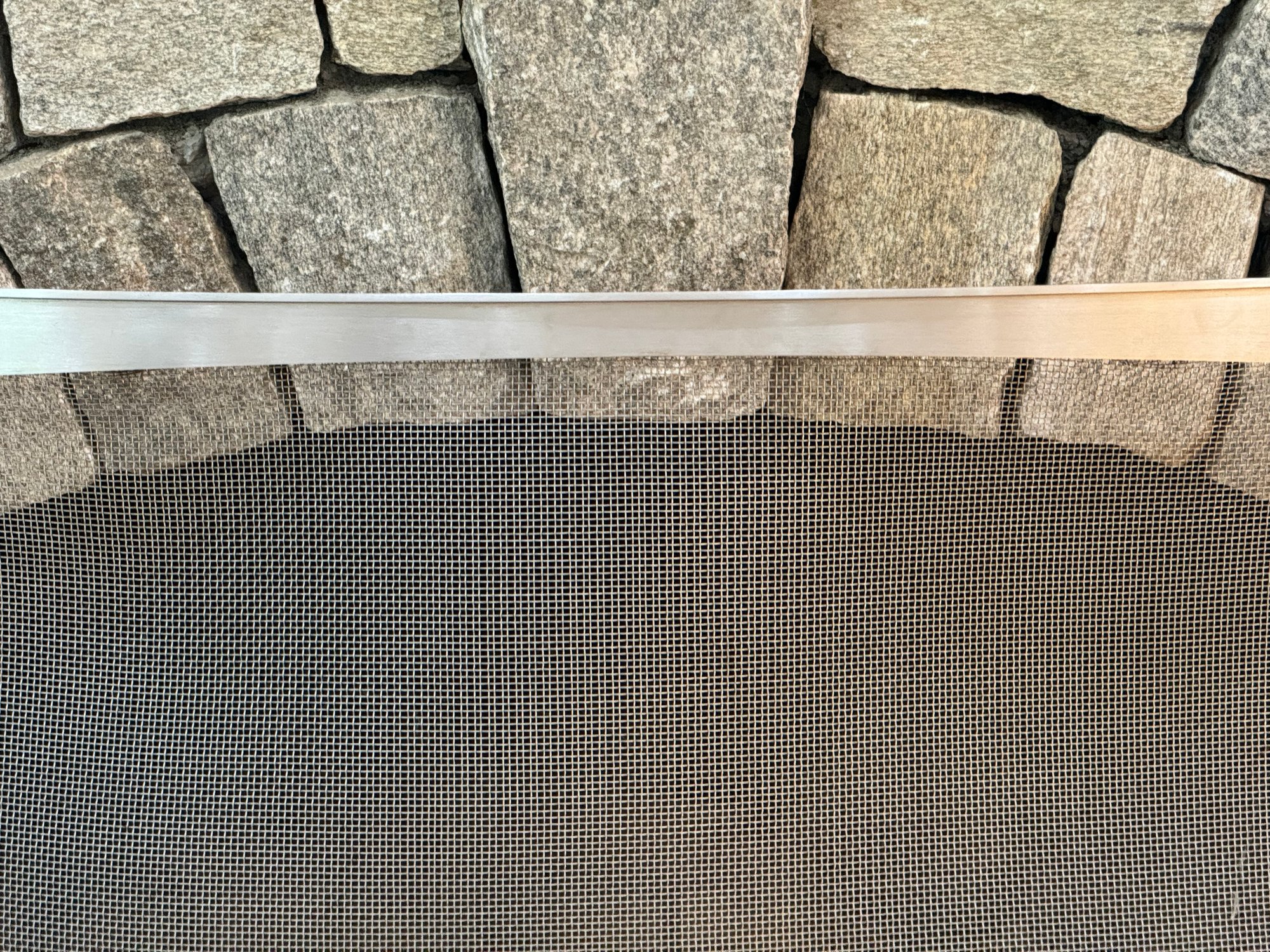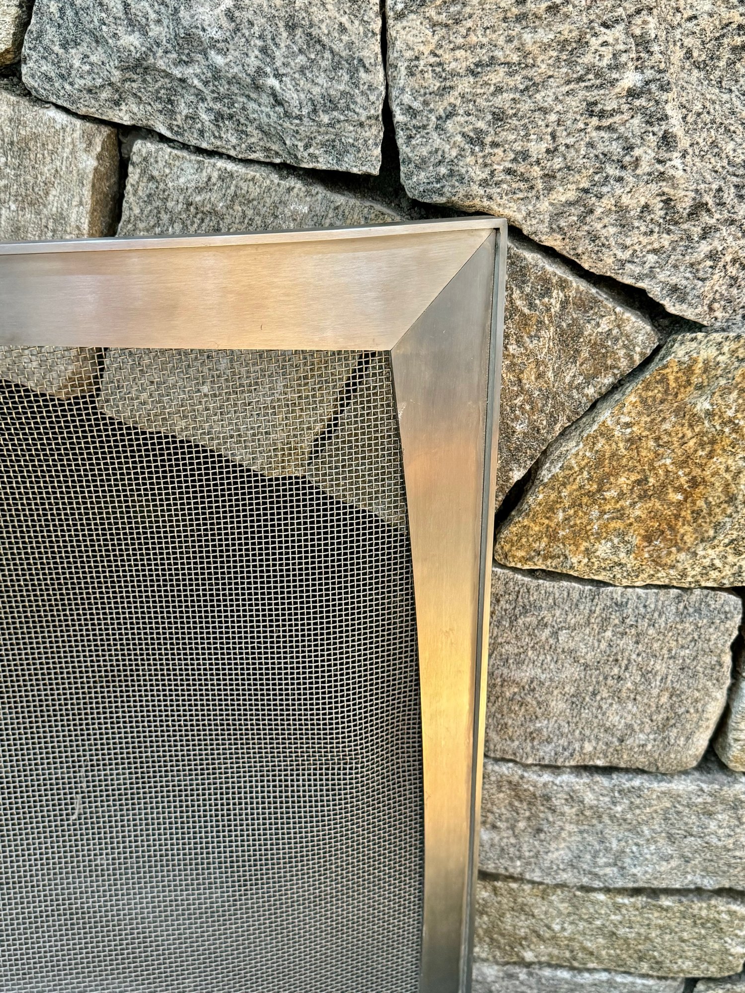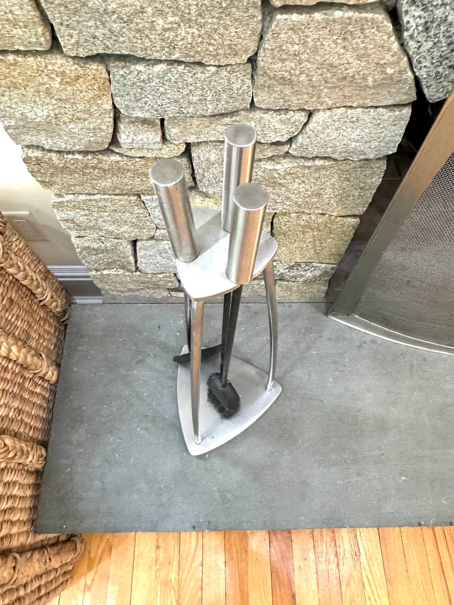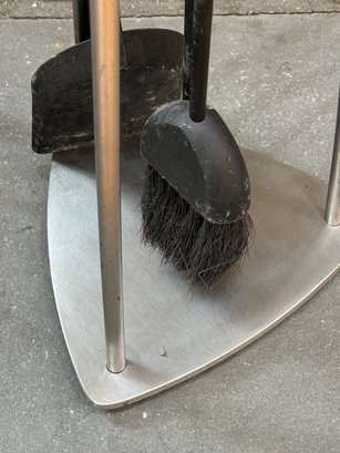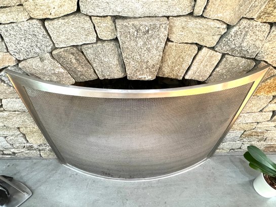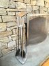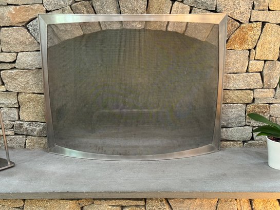 Minimal + Modern mesh arched shape fireplace screen and tool set. Condition a good looking set consis with use. Note that the shovel tool top needs some glue to hold the top to the tool easy fix.
