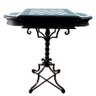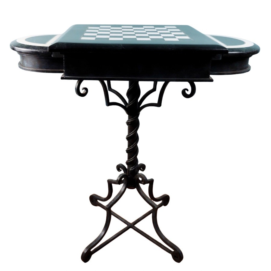 Great inlaid marble game table with side storage compartments on wrought iron base.