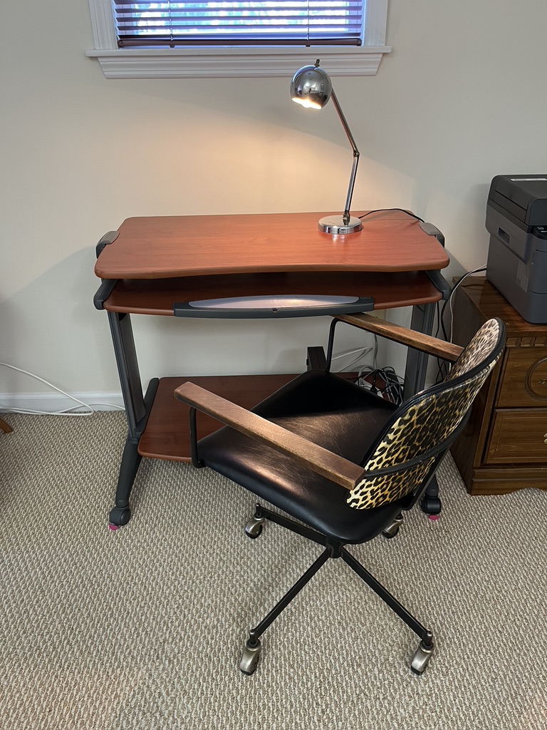 Laminated wood desk, with sliding computer keyboard drawer, and shelf, Tienson chrome like table lamp, and vintage office chair. Chair 22x18x31, lamp is 17".
