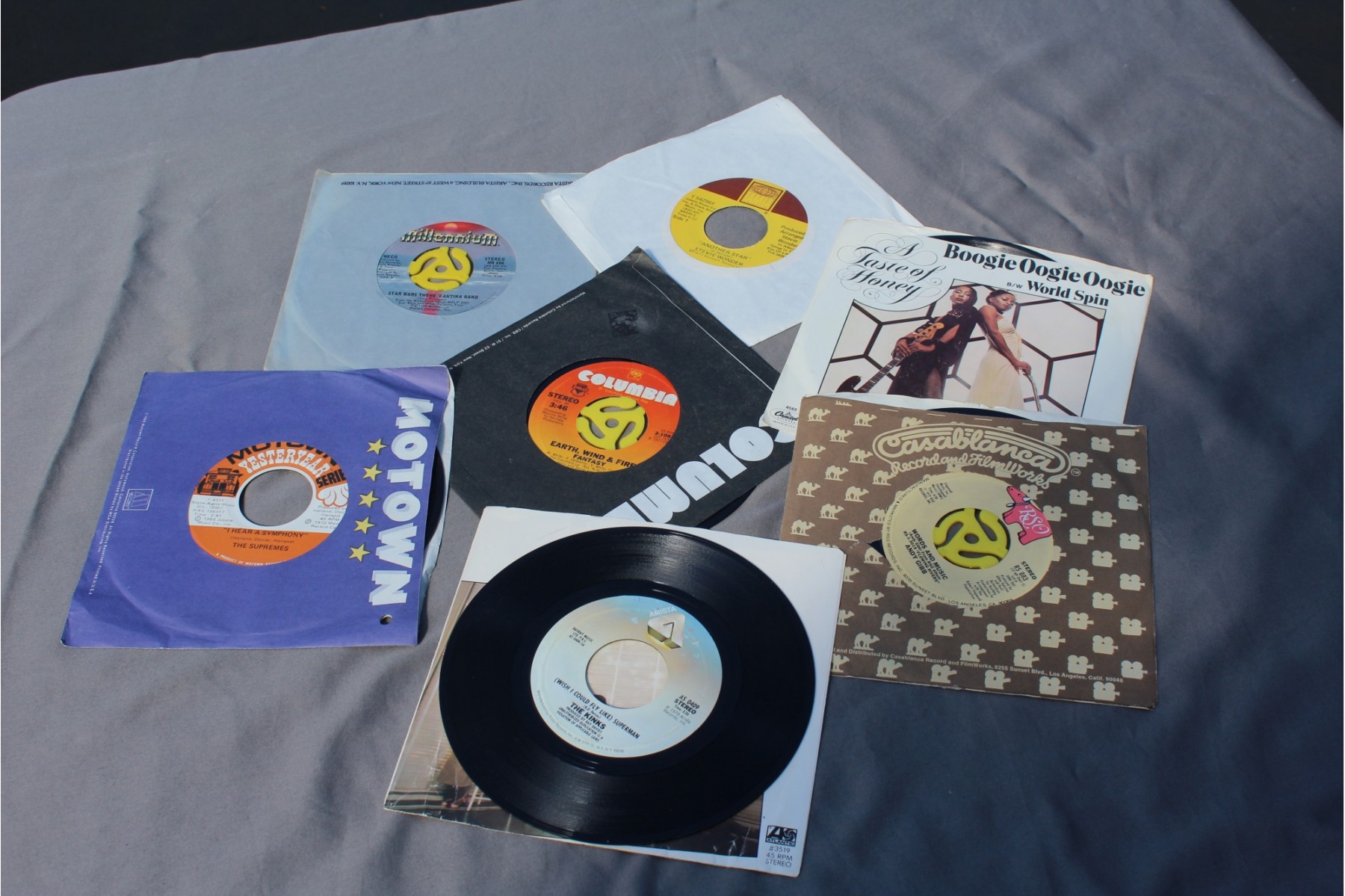 Very cool collection of 45's with 2 ring inserts to play on your vinyl player. Also includes the Supremes, Stevie wonder and the Kinks. 7 in total.