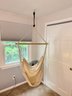 Wood bar is 38” length. The chair will be untied from the ceiling hook, hook doesn’t come with it.