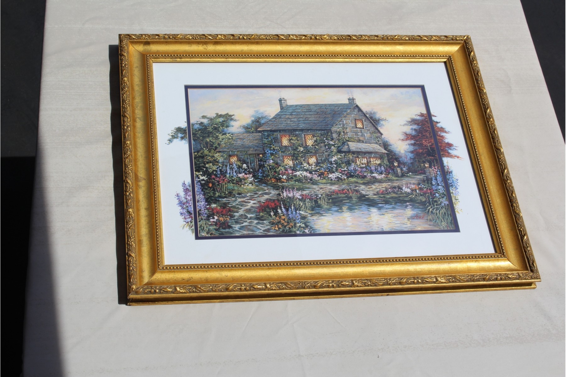 Titled "Evening Glow", this print uses the style of extending the lithograph onto the matting artistically, very lovely effect. 19 x 24 framed, 12 x 16 visible. Indicated as signed by artist.