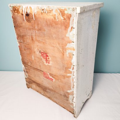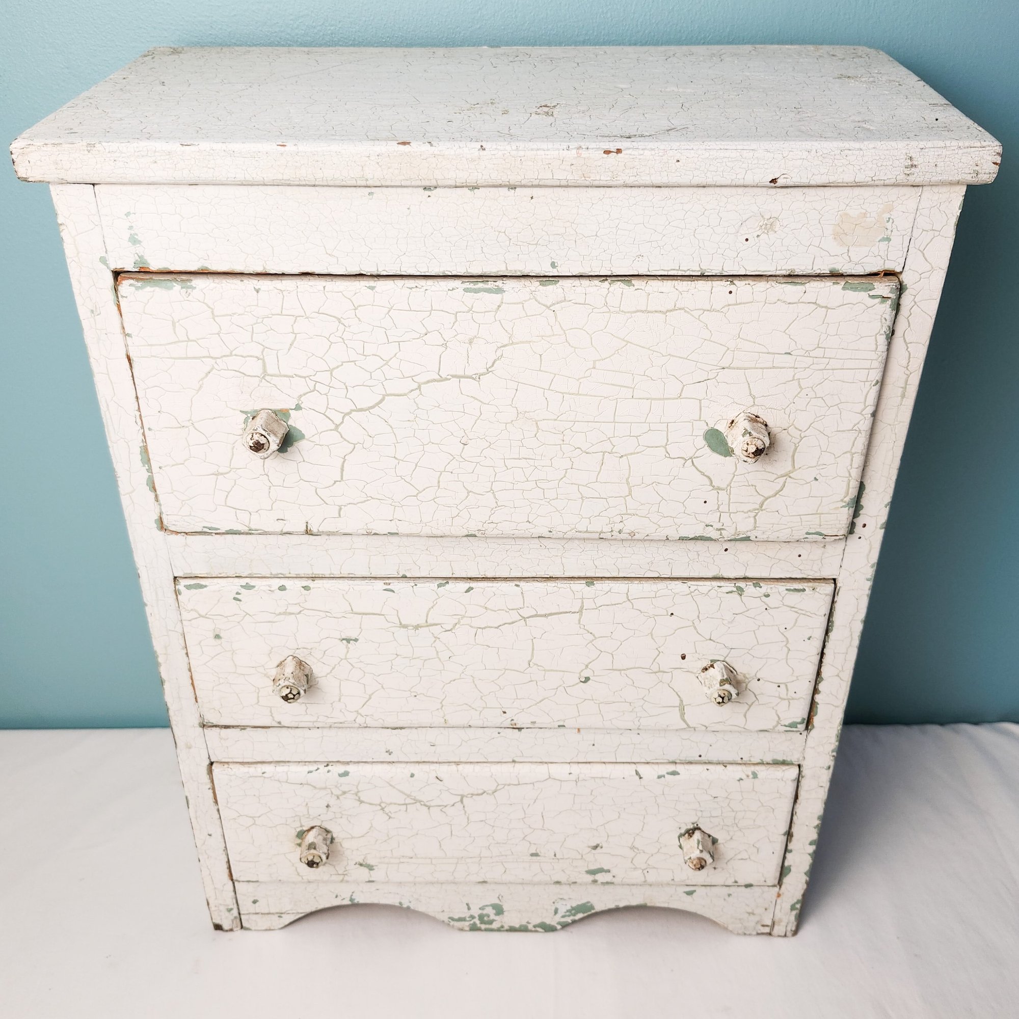 Sweet little three drawer doll dresser with a great crackle finish of white paint over green.