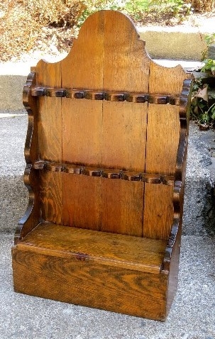 A quite attractive countertop or wall hung country pine spoon rack w/storage box for extra utensils or household bric-a-brac. Measures 23" tall x 13" wide. A nice one that will go well with many spaces & places.