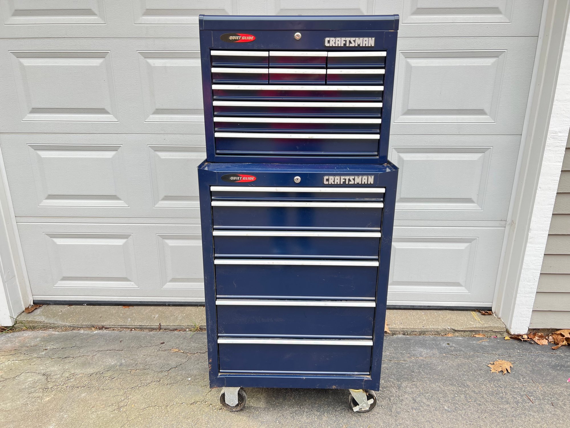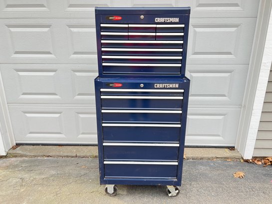 The tool box is in great shape, no keys. Comes with all tools shown. 27" width, 18" depth, bottom is 41" height, top is 20" height.