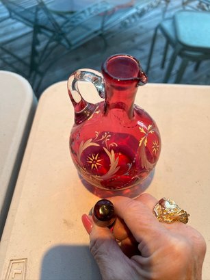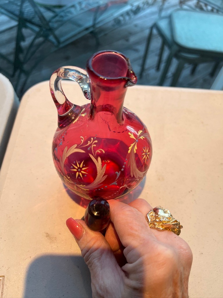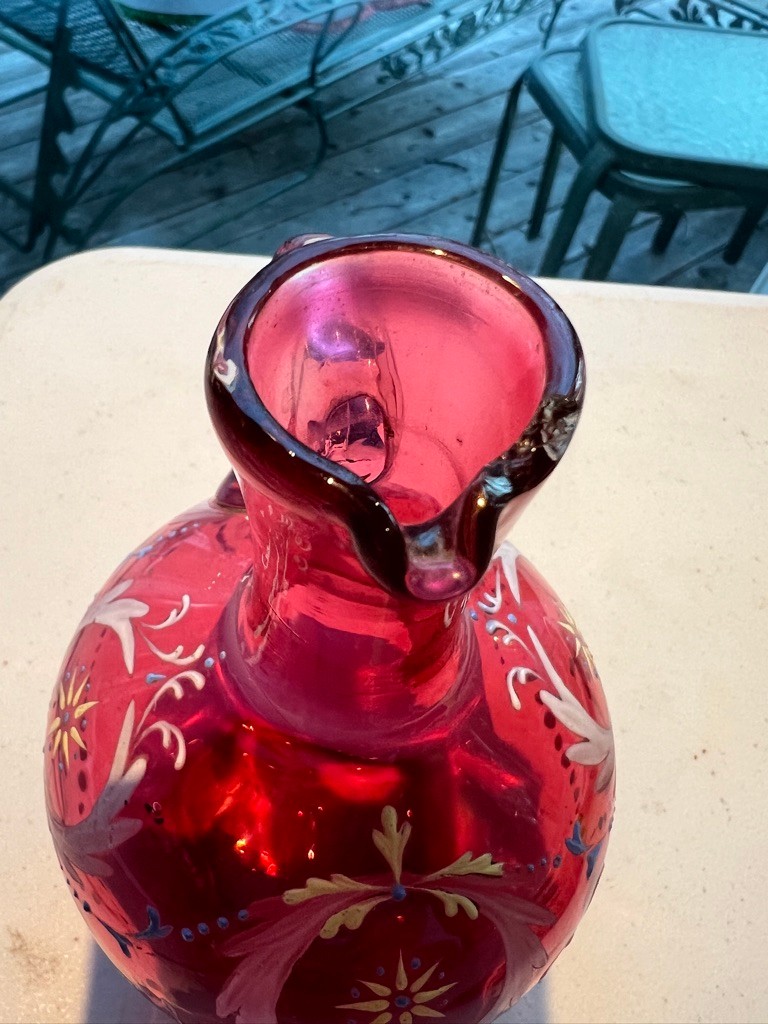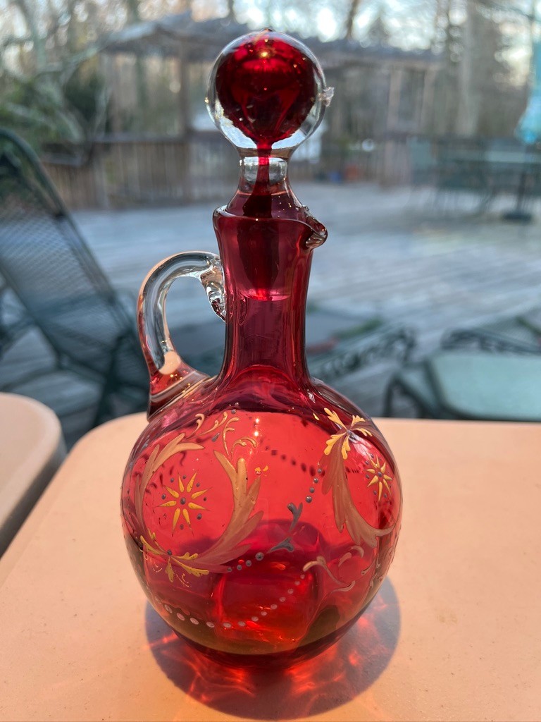 This is likely a Victorian-era cranberry glass decanter or cruet, featuring an applied handle and hand-painted or gilded enamel decoration.