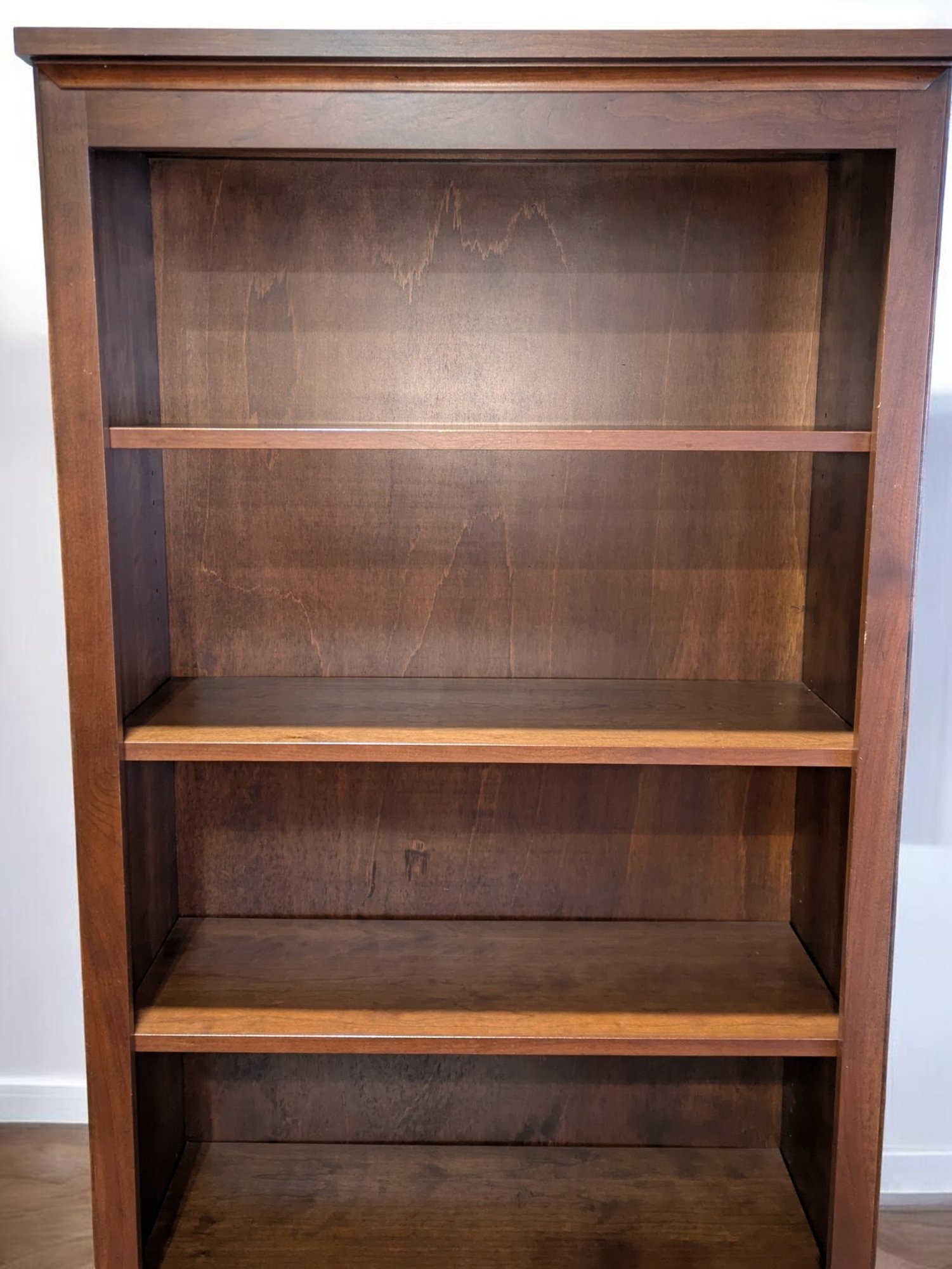 Crate & Barrel Tall Darwood Stand and Bookcase. Dark Walnut Finish With 5 Adjustable Shelves. Simple Cove Molding at the Top with Beveled Rails Down the Sides. Marks and Wear Consistent with Age and Use. Overall, Very Good Condition. Please see all photos as part of the description and condition. 30.5"W x 73"H x 12.5"D