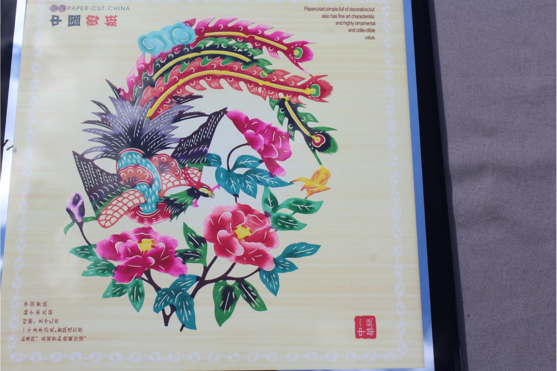 This is is really quite incredible, I opened up to just determine if it is mounted on board and it is not and you can see the tissue thin paper which has been hand-cut & colored. Remarkable the delicate beauty of this work. 10" x 10".