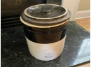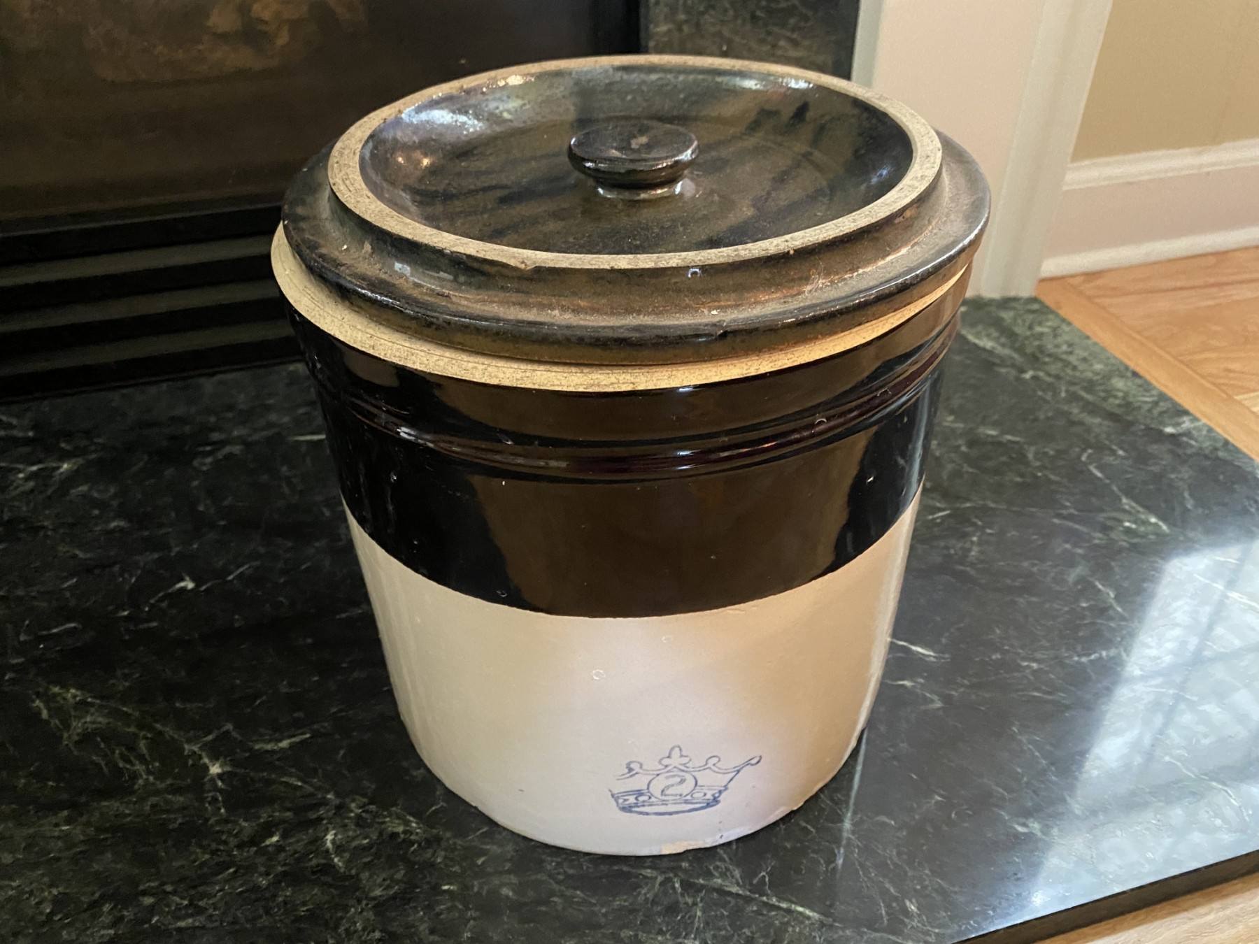 this crock has a lid which is ususally not there. It is 9 1/2" diam and 10" tall. small ding on bottom.