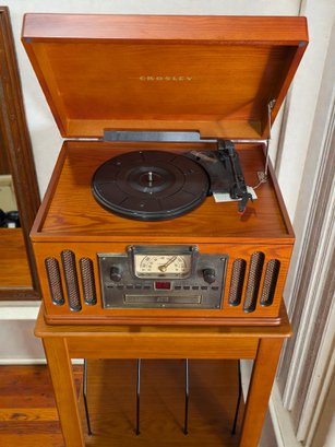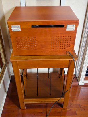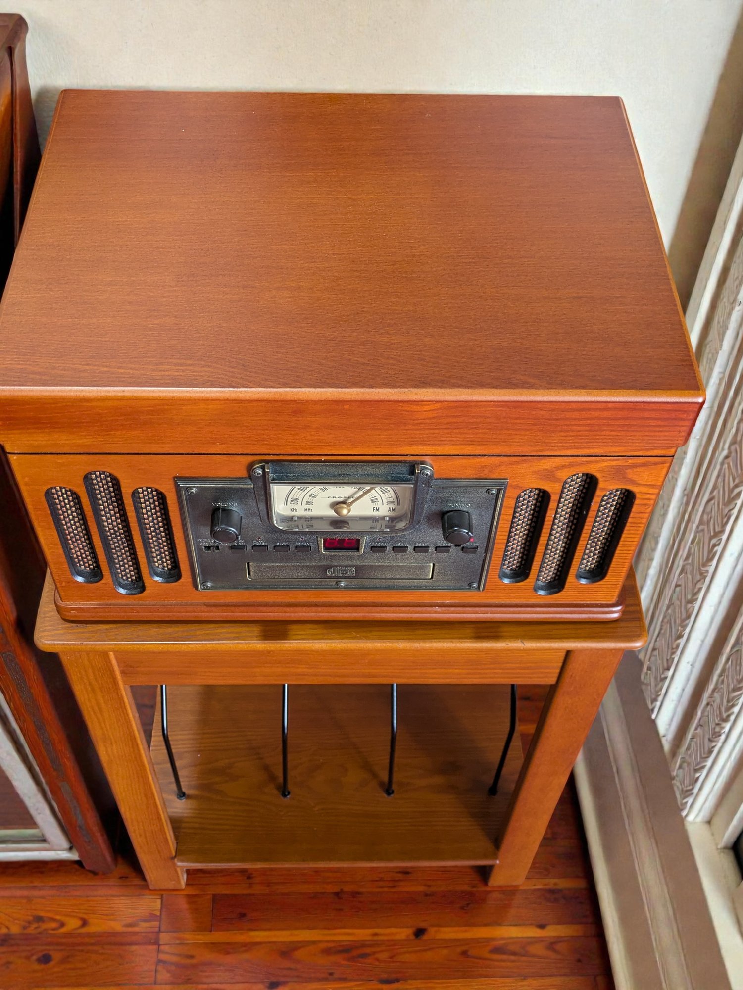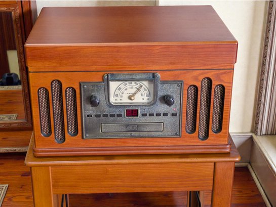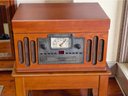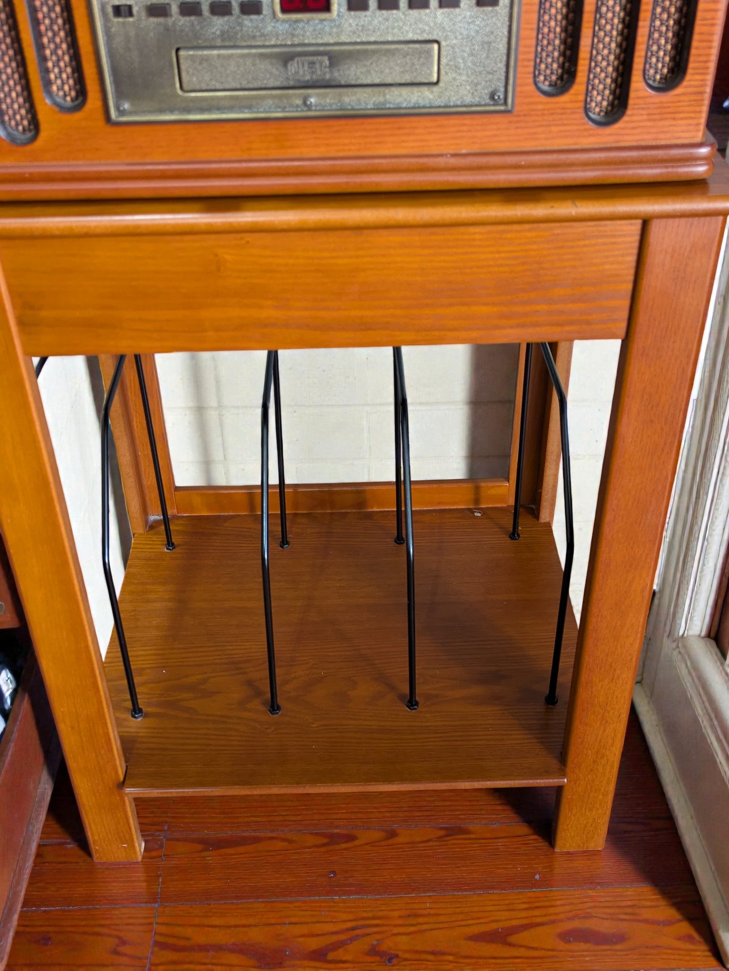 It includes built-in stereo speakers, an aux input, a headphone jack, and often features a brown/paprika-colored wooden cabinet design. Plays vinyl records with 3 speeds, CDs, cassettes, and radio (AM/FM). The radio sits on a wooden base featuring record dividers. All funcitions tested and working. In Very Good Condition. Please see all photos as part of the description and condition. On Stand - 18.5"W x 34"H x 15"D / Unit 17"W x 10"H x 12" D