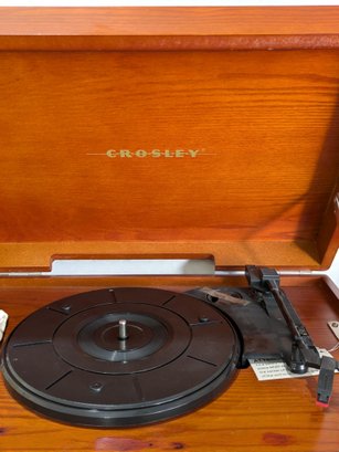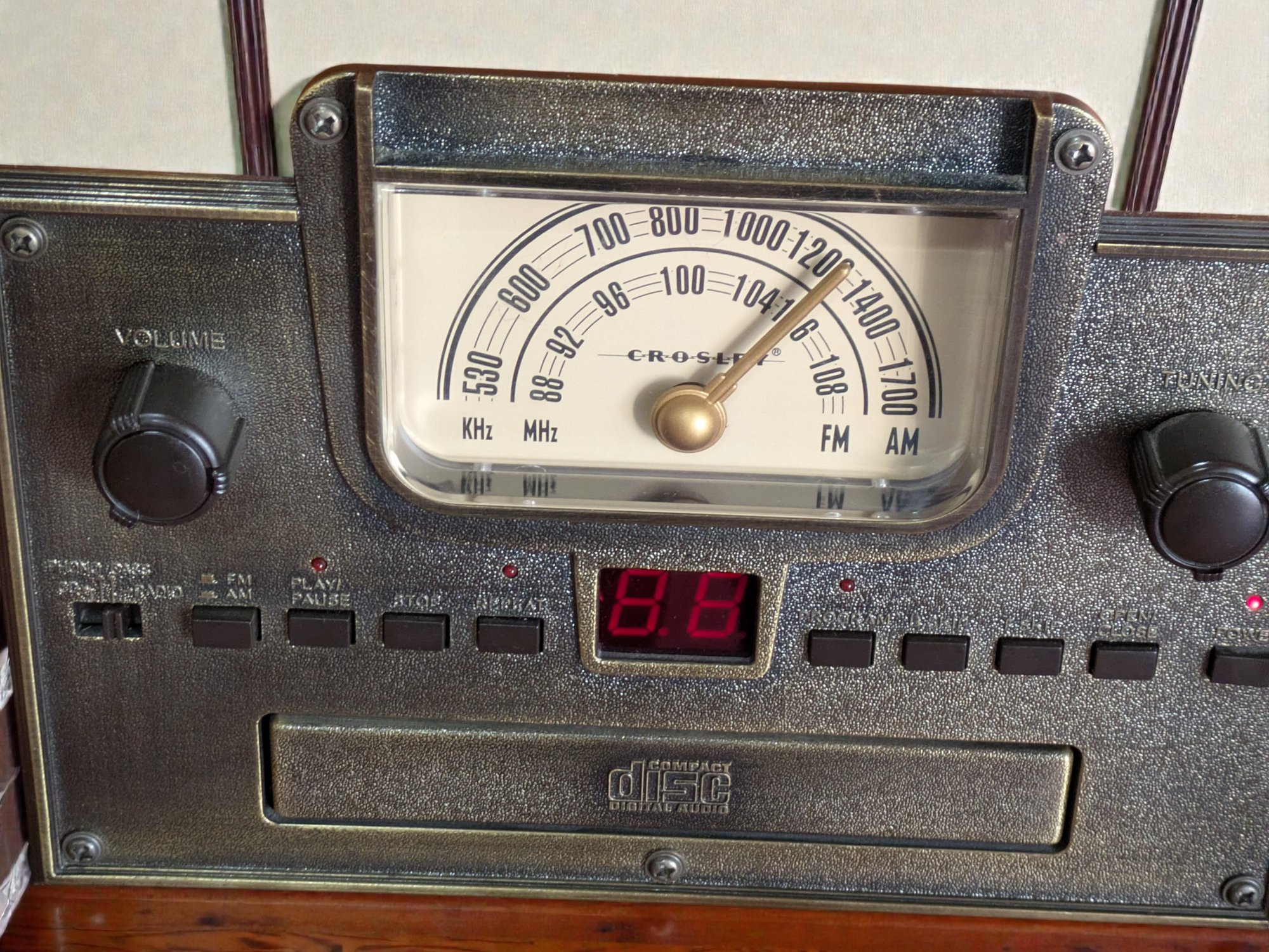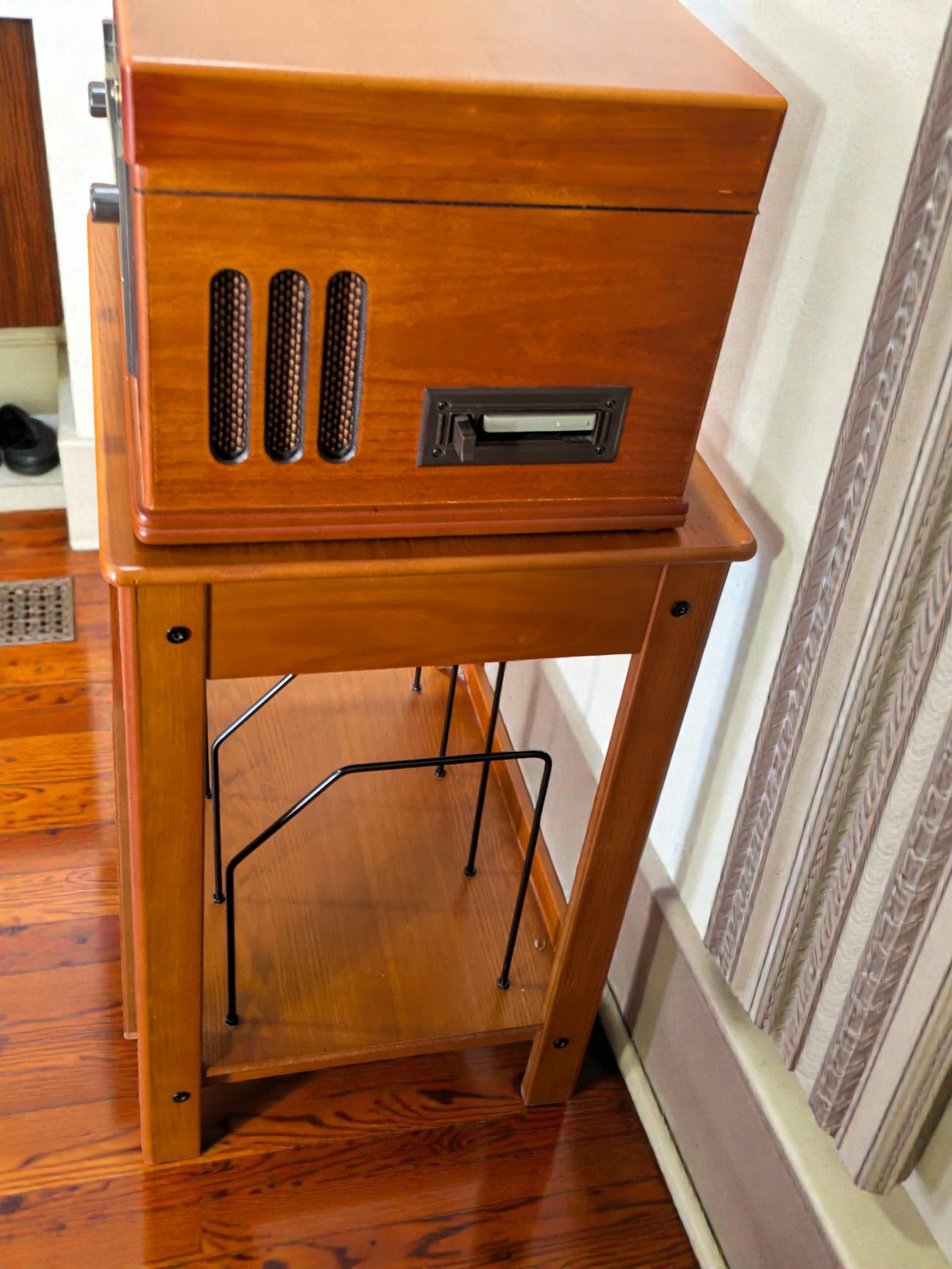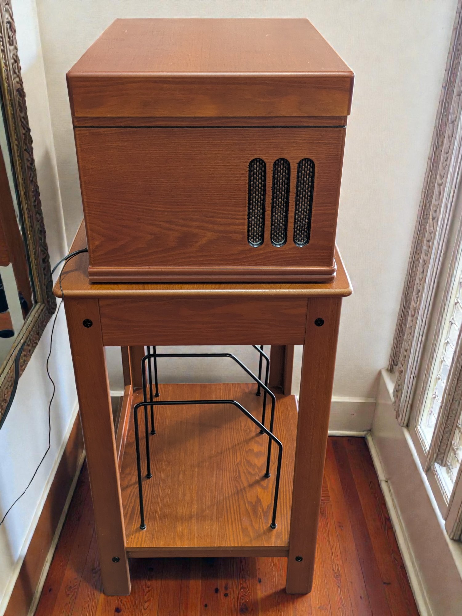 It includes built-in stereo speakers, an aux input, a headphone jack, and often features a brown/paprika-colored wooden cabinet design. Plays vinyl records with 3 speeds, CDs, cassettes, and radio (AM/FM). The radio sits on a wooden base featuring record dividers. All funcitions tested and working. In Very Good Condition. Please see all photos as part of the description and condition. On Stand - 18.5"W x 34"H x 15"D / Unit 17"W x 10"H x 12" D