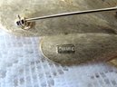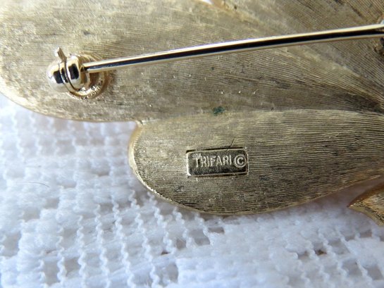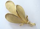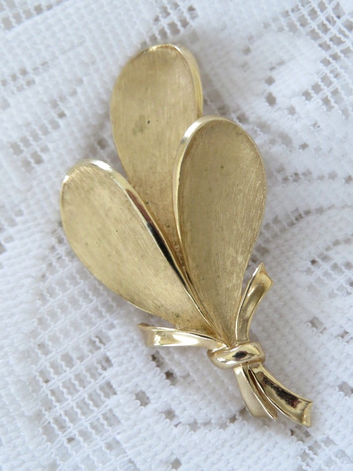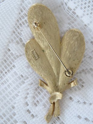 Vintage Crown Trifari gold tone tied leaf trio pin. Pin has working clasp, measures 2 1/2" high and is signed on the back of the pin.