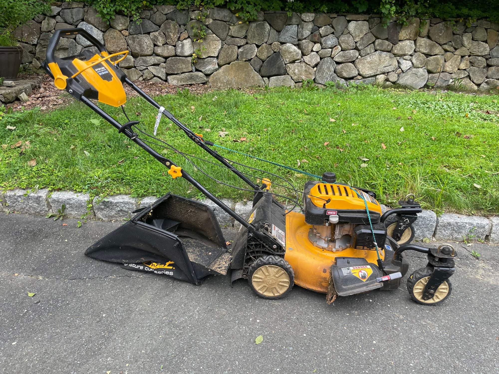 Push mower. Hooked on bungee cord. Evidence of use, could use cleaning. See photos for more conditions and sizing.