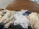 2 panels 44 x 55 cream colored lace; 2 panels white cafe; 6 panels 46 x 48 blue embroidered edge with tie backs; 1 striped cloth; 4 packages 63" blue voile pockets curtains; 2 green valances in packages and more