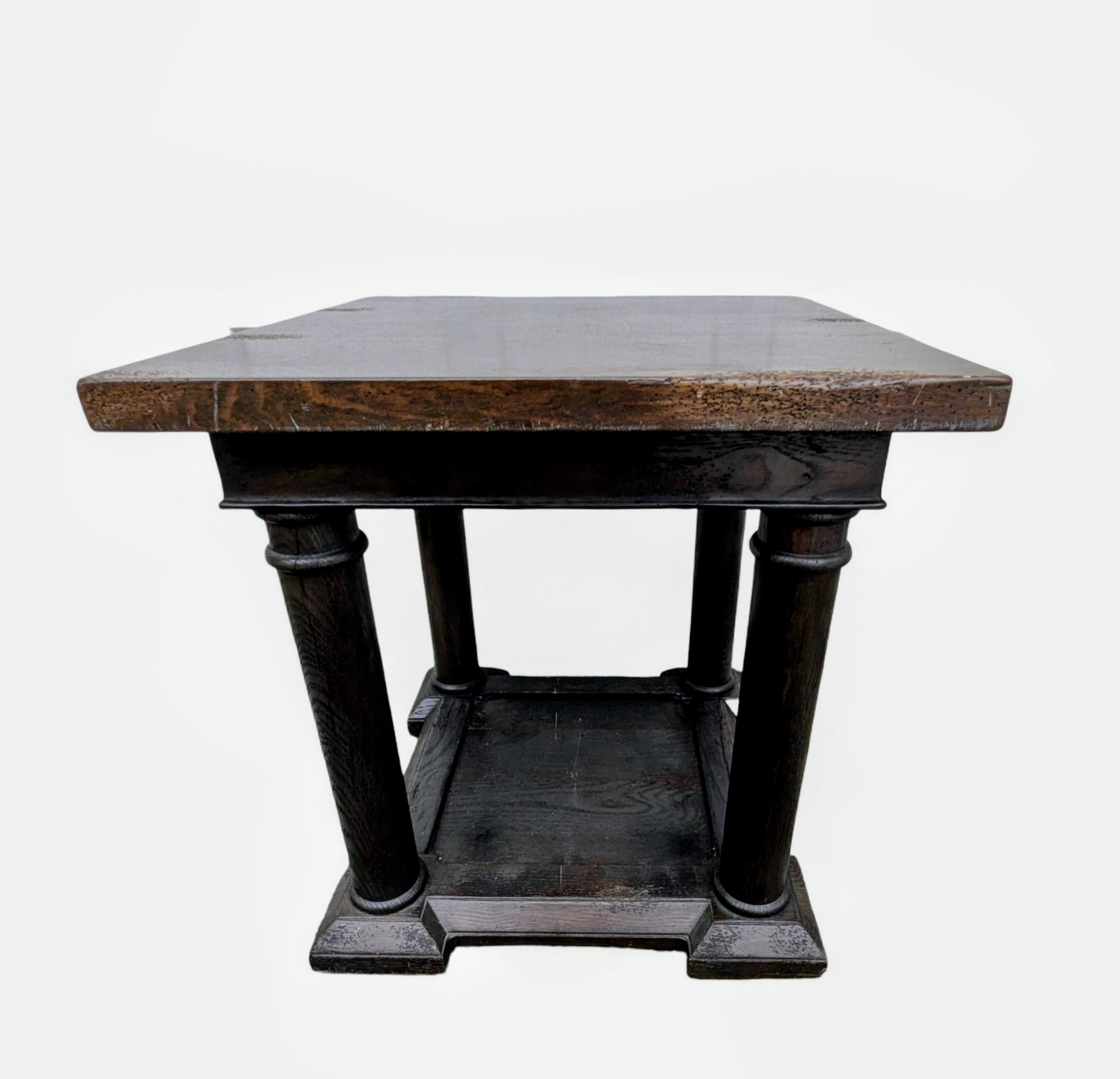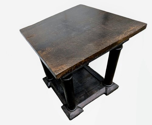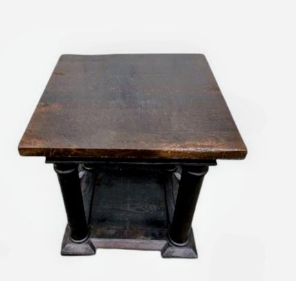 21"x22" x 23" tall slight loss of stain on surface that seems fitting based on age. It still presents very well. And it's in great condition in terms of durability