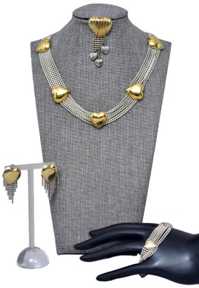 PLEASE NOTE: Although the pin is marked 14K, when tested, it did not test positive for 14K. The hearts on the bracelet and earrings both tested positive for 18K, but it is only the front part, not the back. The back is sterling silver. The hearts on the necklace also did not test positive for either 14K or 18K. However, it is sterling silver.
