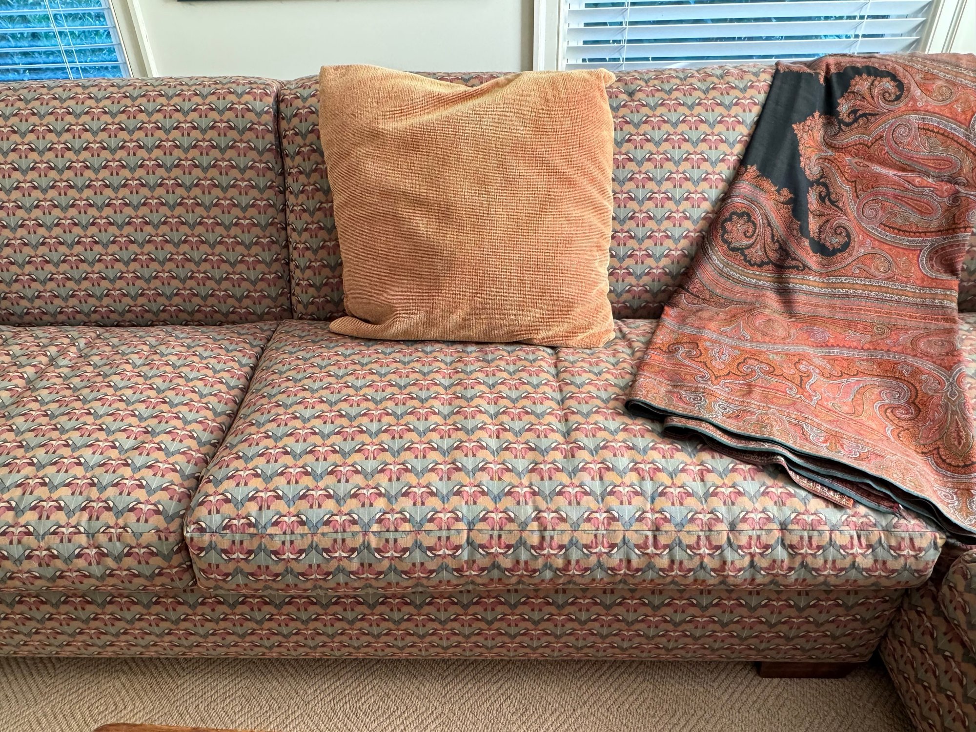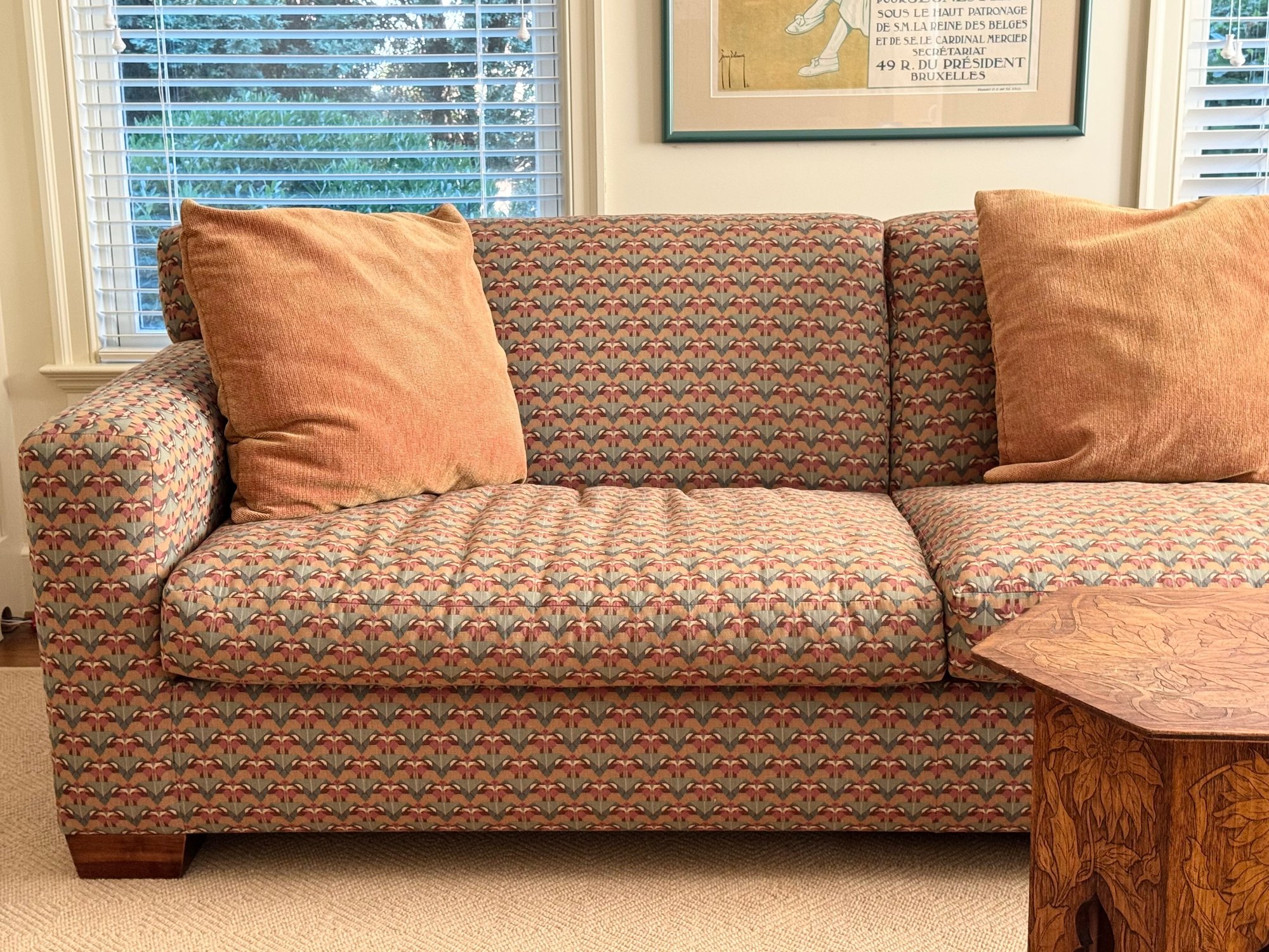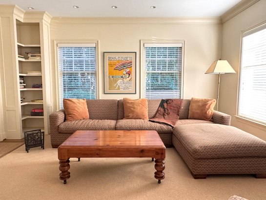 Super comfy sectional sofa in a Frank Lloyd Wright patterned upholstery on block wood legs. Perfect for large family rooms or man caves! In two parts for easy moving.