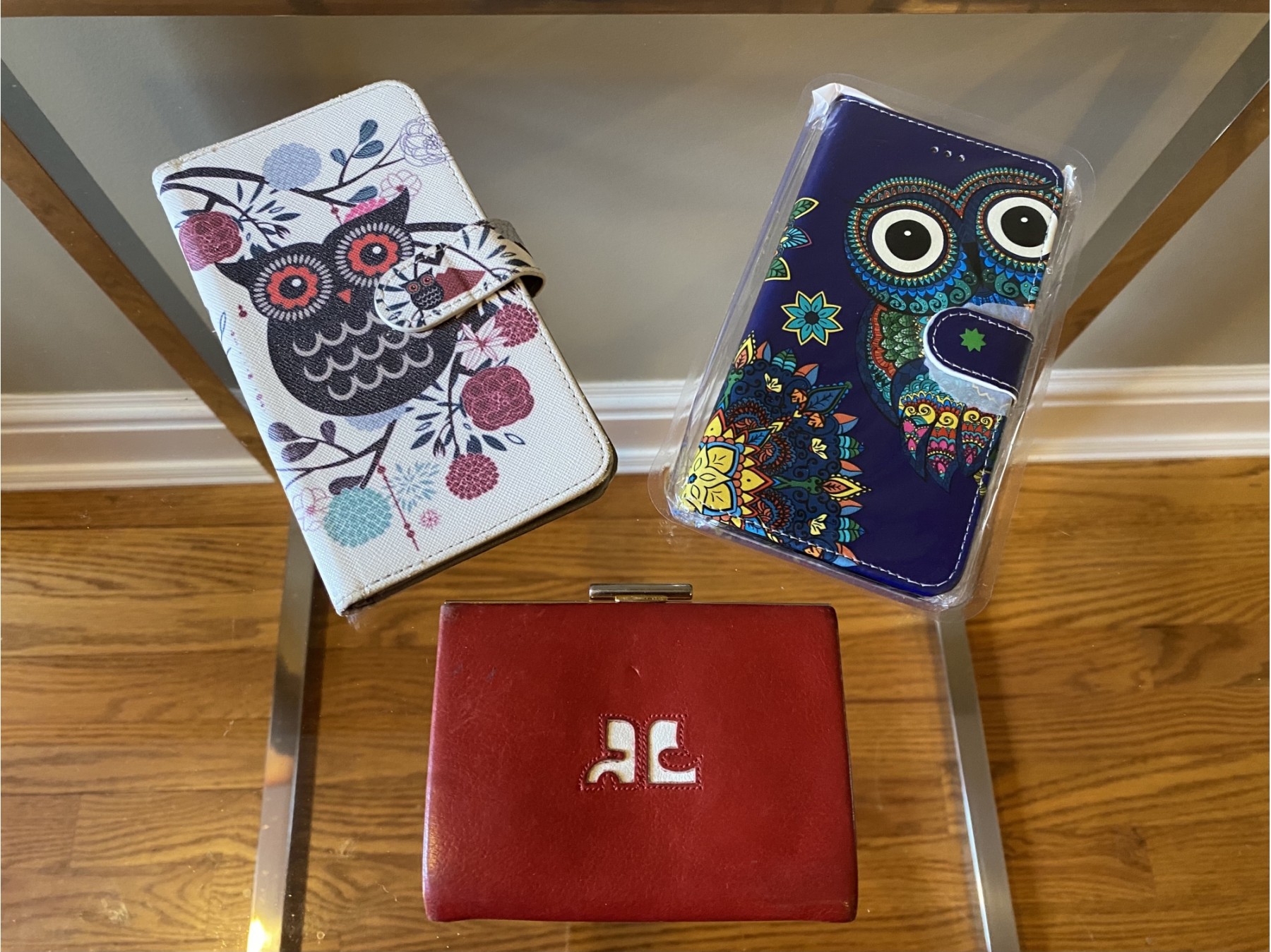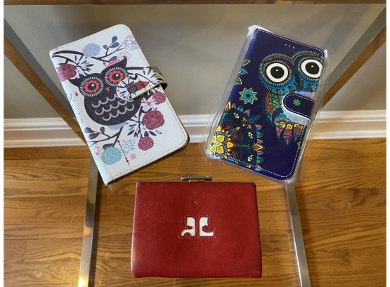 2 owl motif folding cases and a leather coin purse with notable wear, see all photos for details.