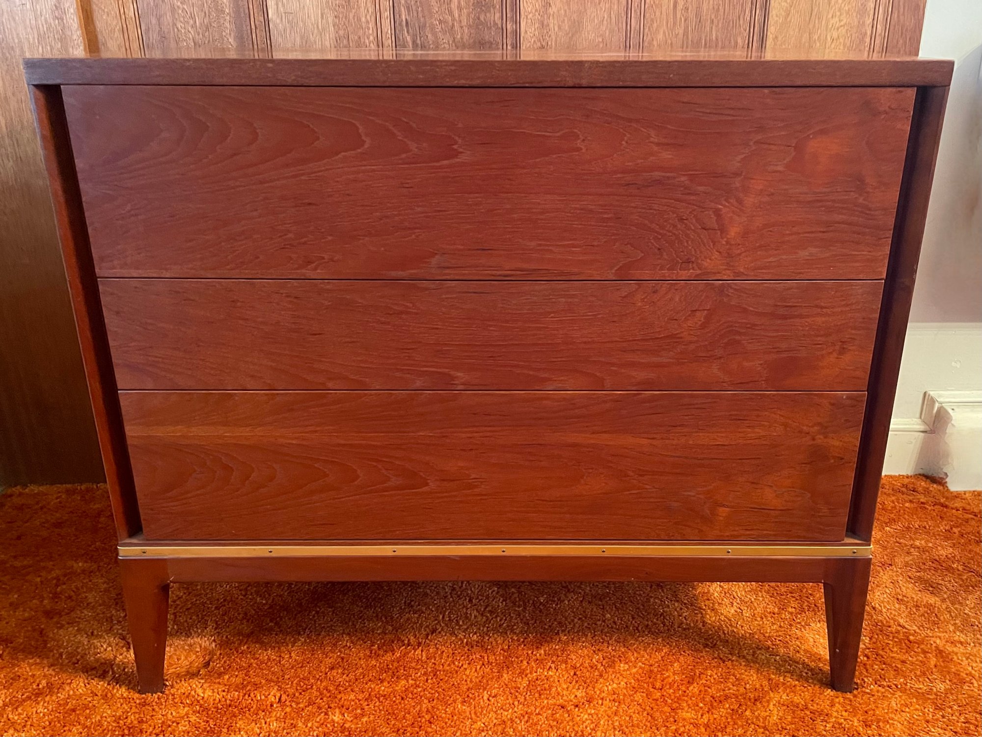 A 3 drawer chest - each drawer opens from the sides. It has great subtle lines, tapered legs, dove tailed drawers, and a brass band below the drawers.