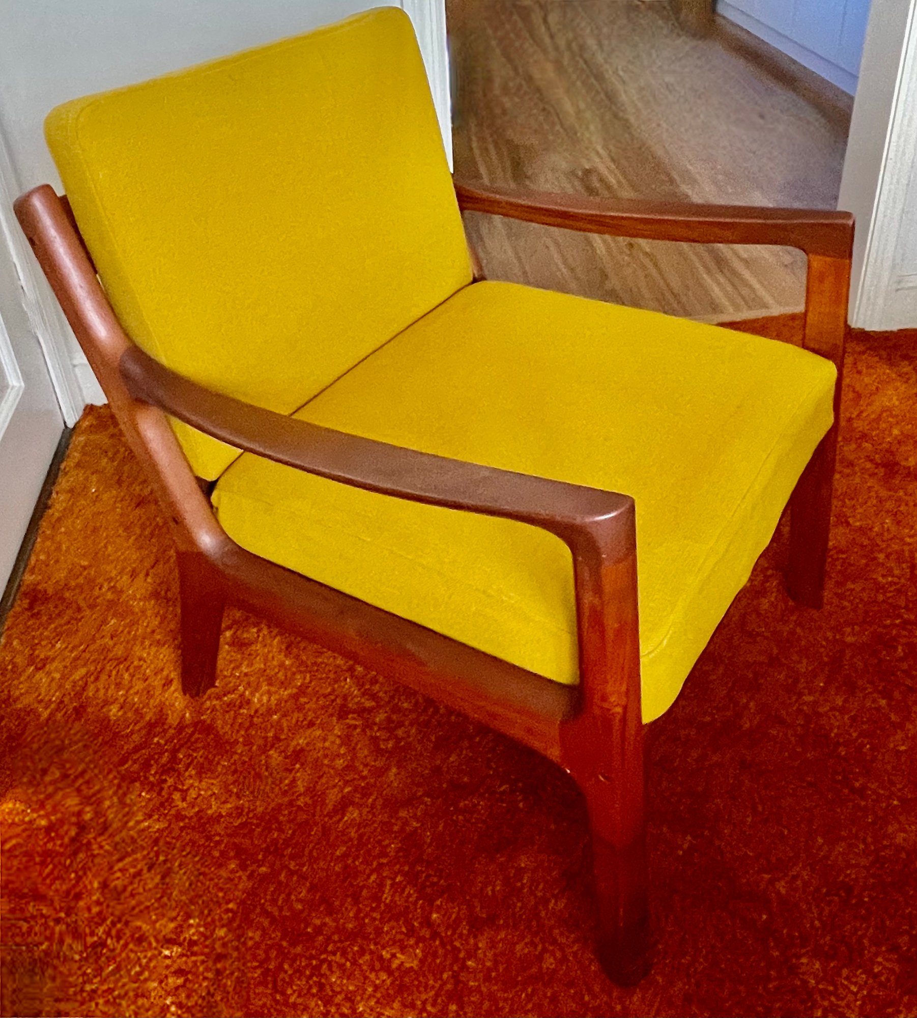 A fabulous teak chair designed by Ole Wanscher and manufactured by France & Søn. It has its original upholstery in a sunny yellow, and the maker's round plaque is on the chair. This is one of two Senator chairs - the other is listed separately.