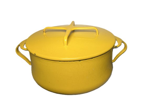 Sought-after Dansk French made IHQ "Kobenstyle" small lidded pot in bright mustard yellow enamel.