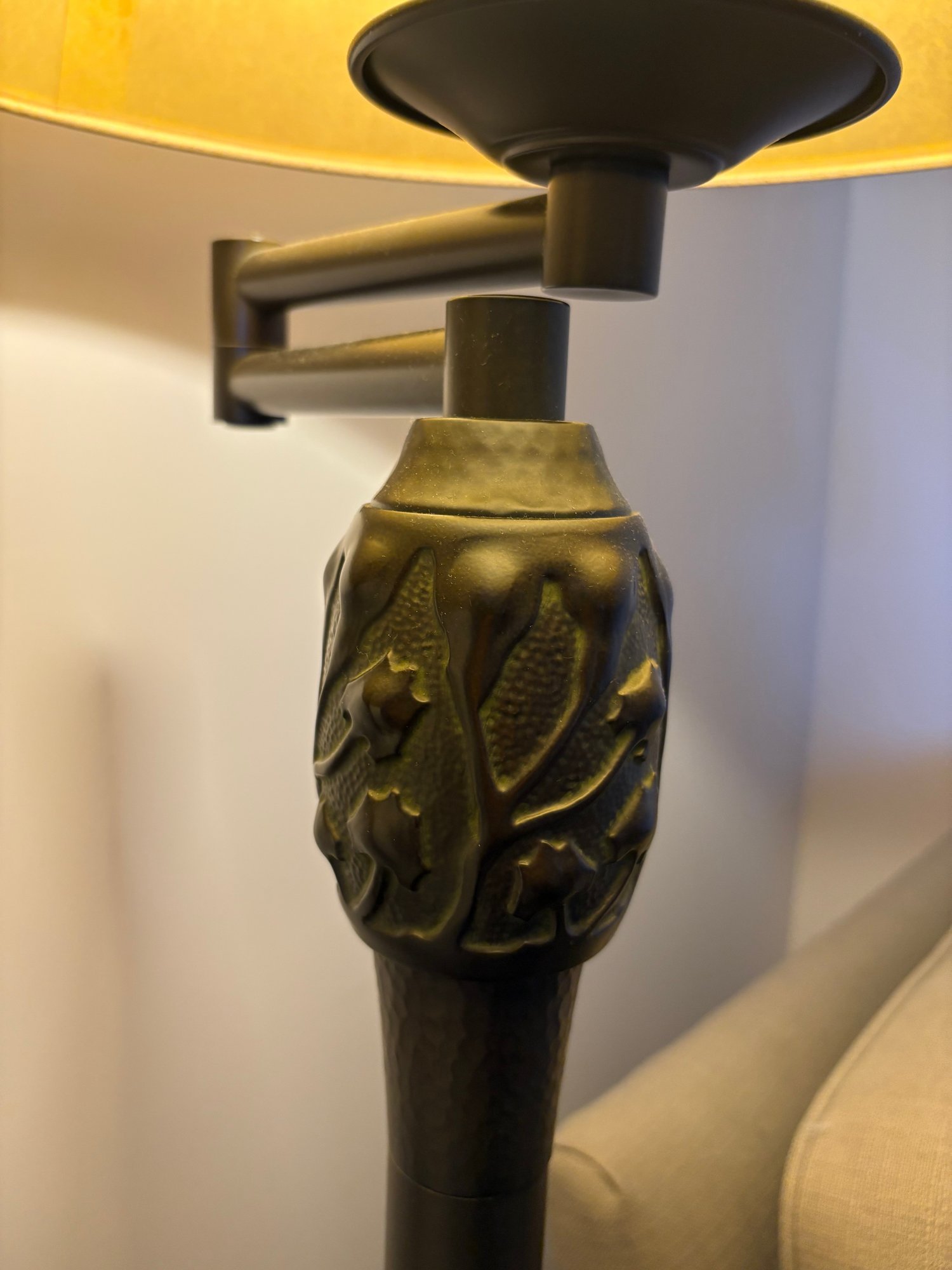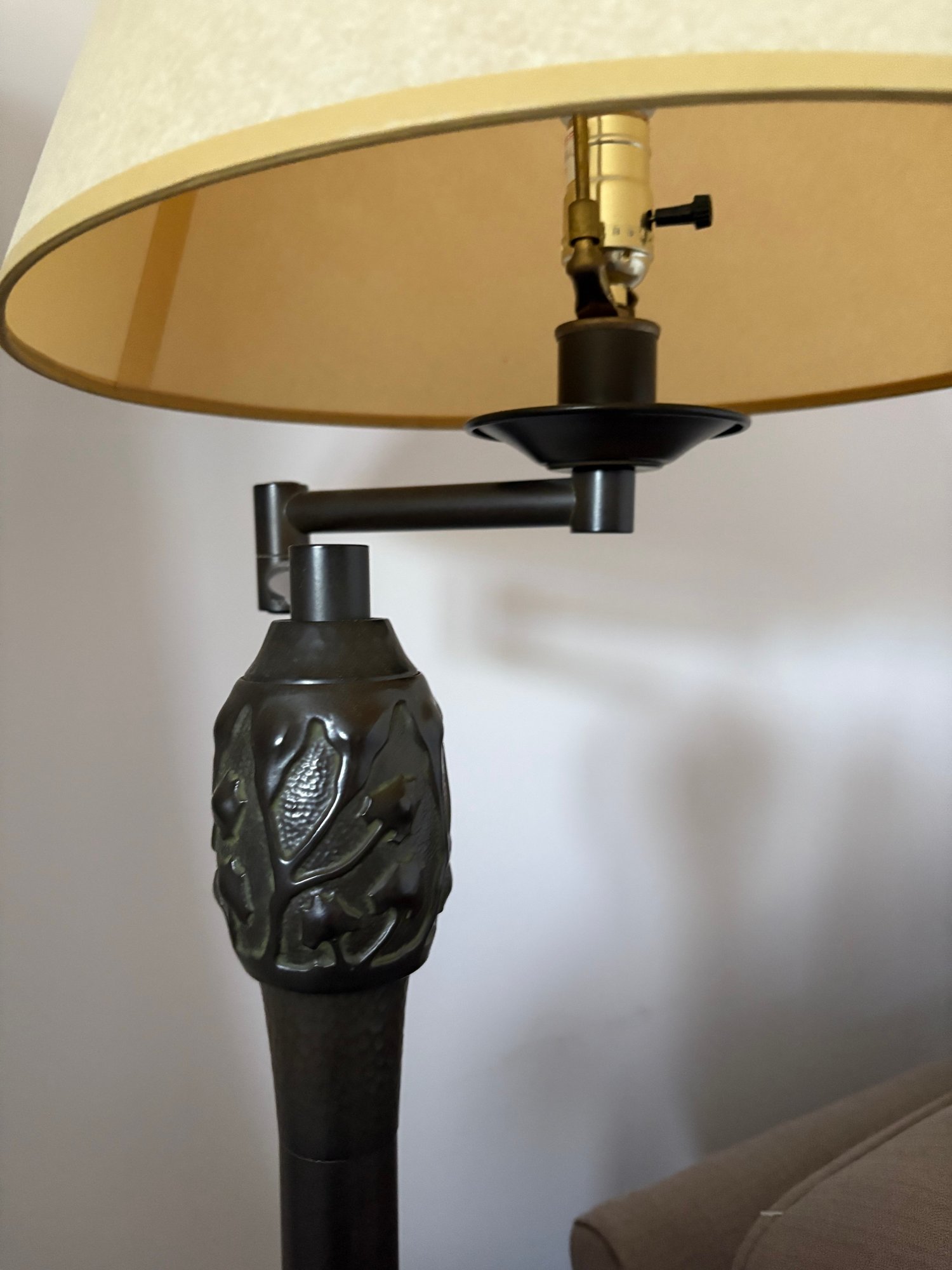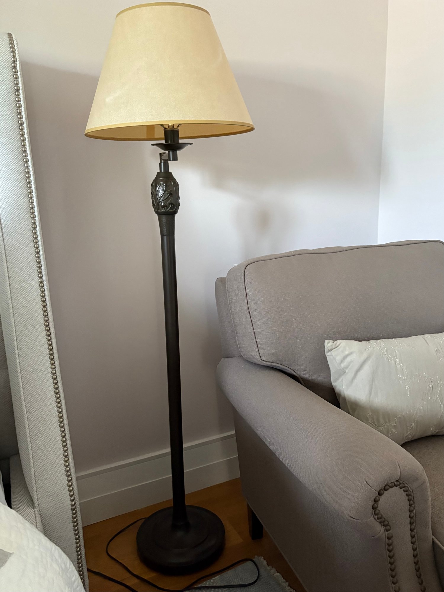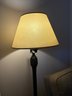 Classic-style floor lamp featuring a cream-colored fabric lampshade and a dark-toned metal base and stem. The stem has decorative detailing near the top, just below where it connects to the lampshade.