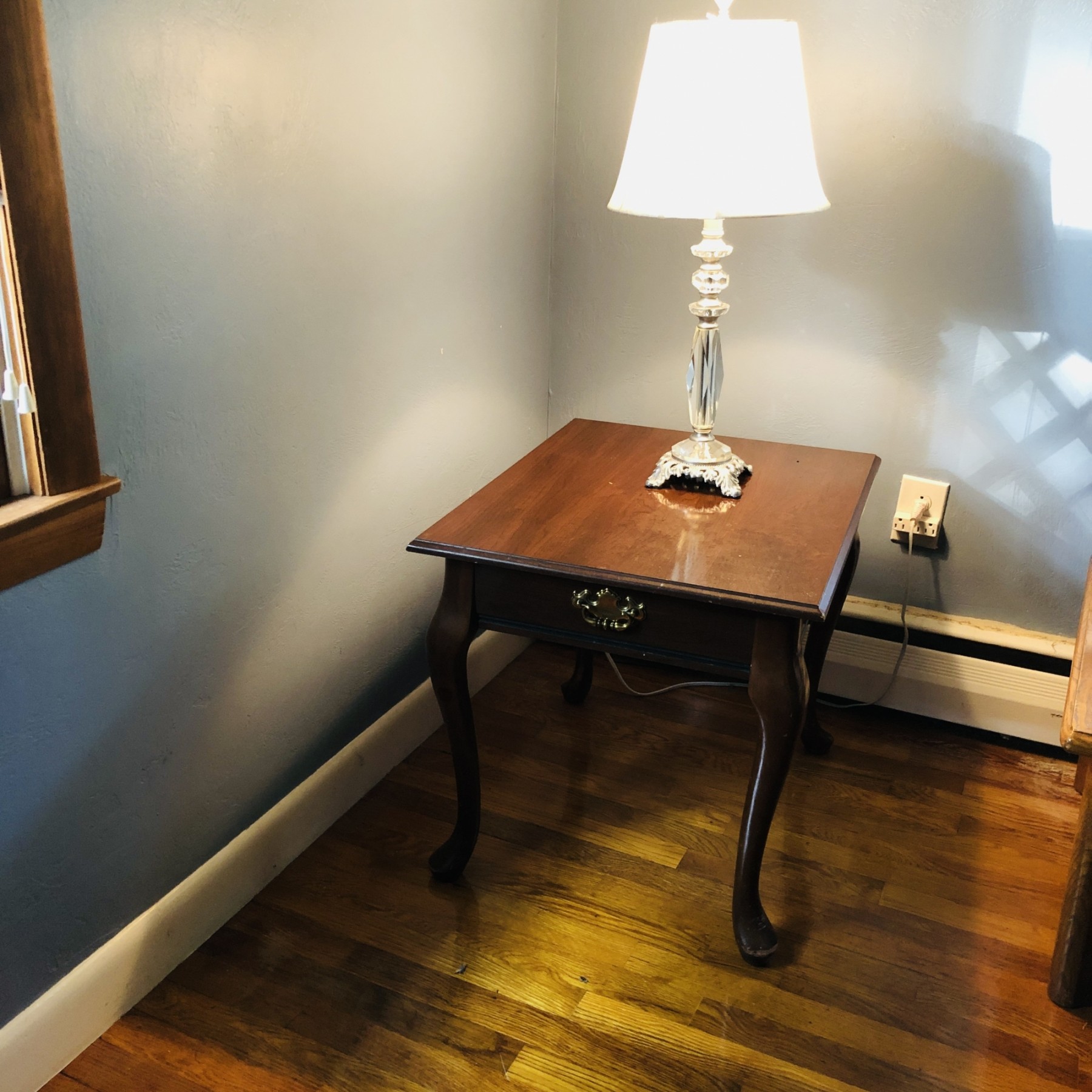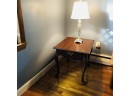 Dark Wood Side Table With Lamp. Faux drawer. Measures 21"x21"x15.5". Some scratches noted on the wood.
