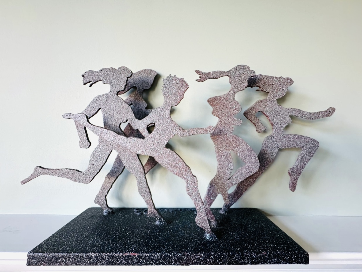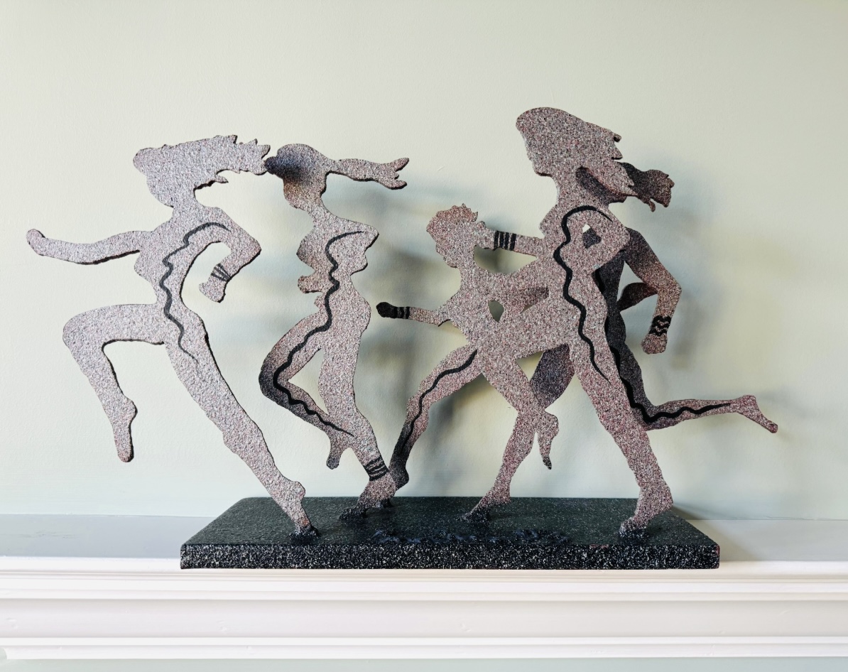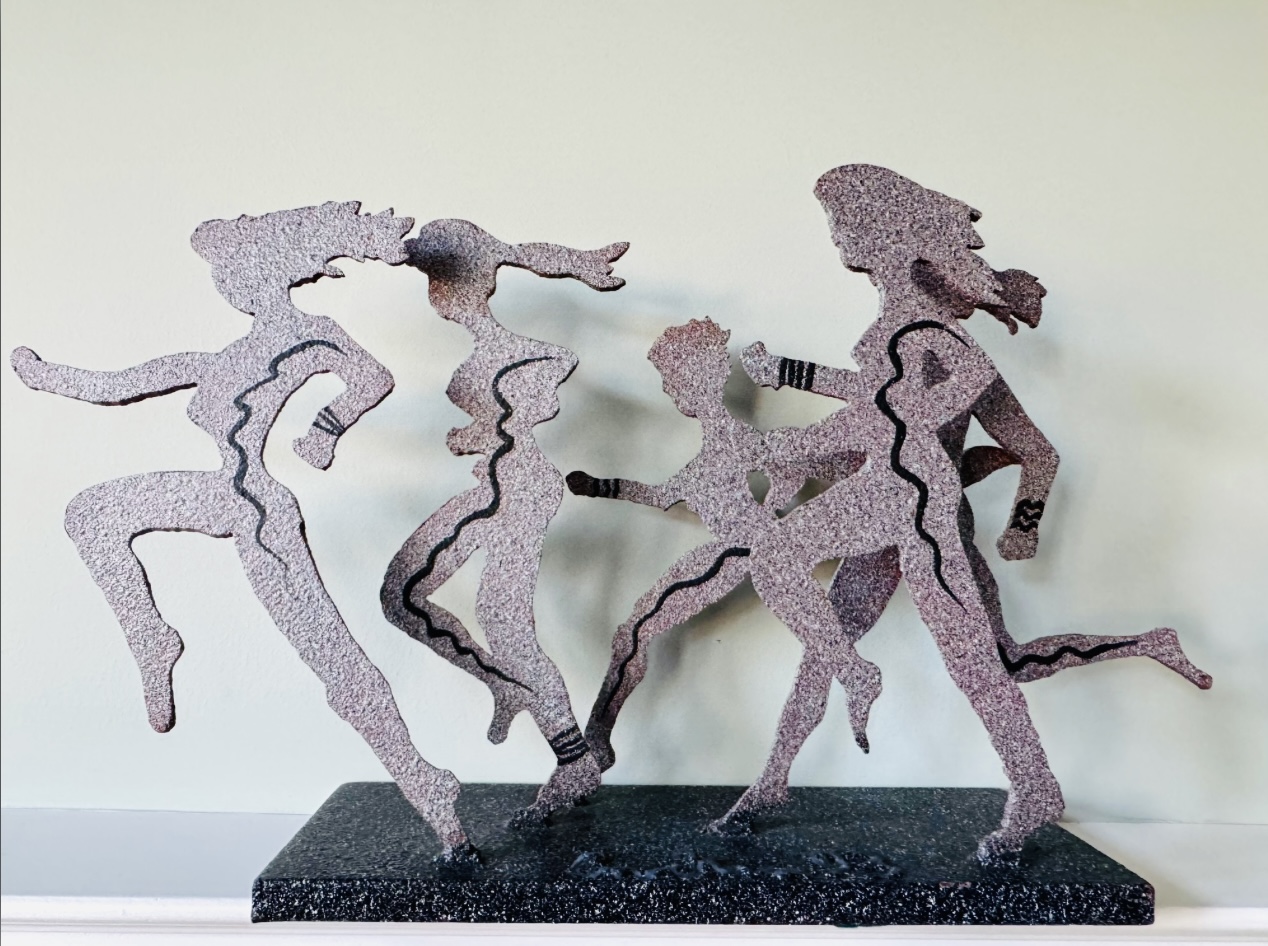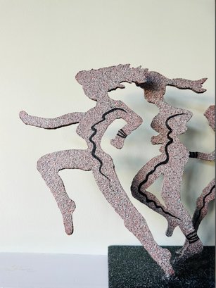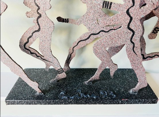 This heavy metal sculpture by 'larger than life' artist David Govedare is signed on front middle of base and dated ‘93 and depicts five figures in the running position. Among his works he was well know for his Runners Sculptures made for various races throughout the country. This sculpture is a heavy cut and welded metal in speckled style finish. It has a small nic on bottom right corner of base see photo otherwise in very good condition. Size 21 W x 12 H x 5 D Perfect for your marathon maven!