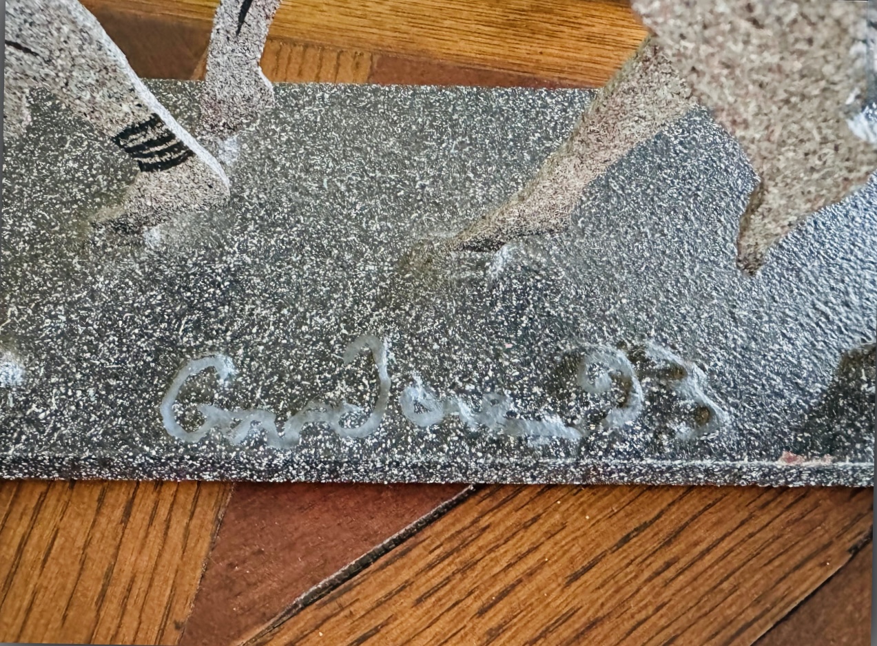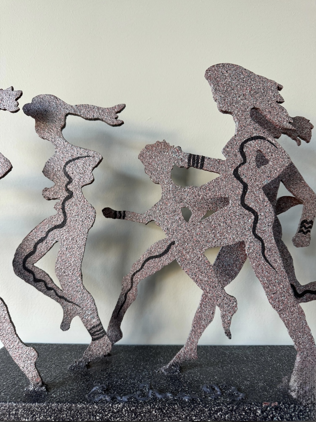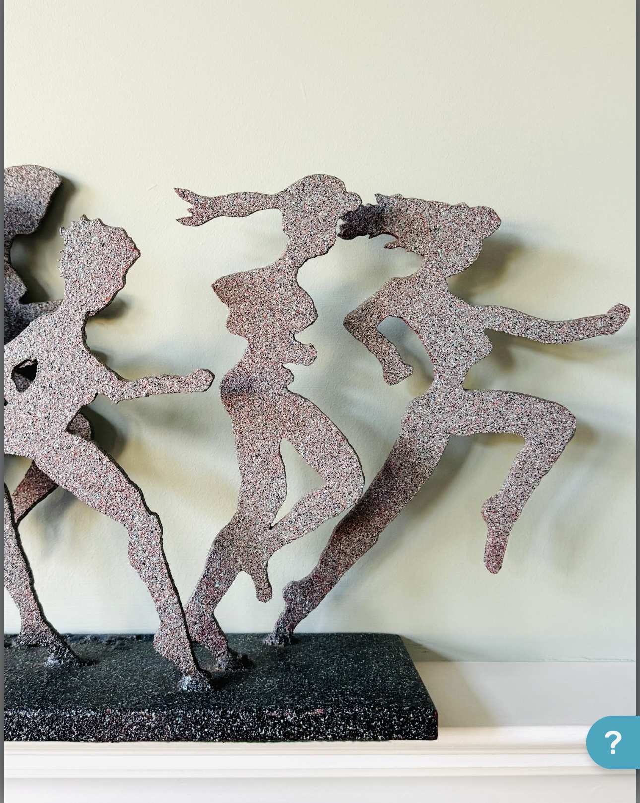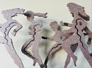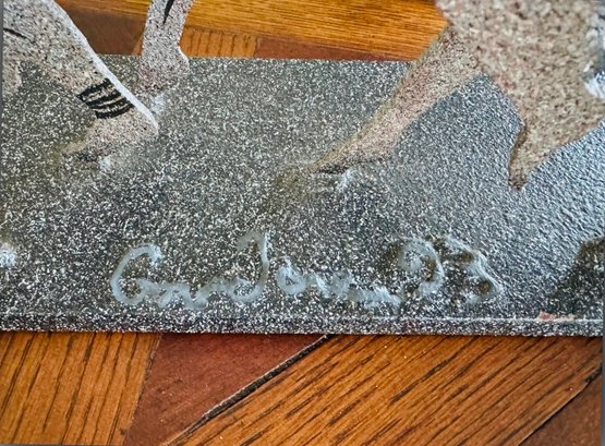 This heavy metal sculpture by 'larger than life' artist David Govedare is signed on front middle of base and dated ‘93 and depicts five figures in the running position. Among his works he was well know for his Runners Sculptures made for various races throughout the country. This sculpture is a heavy cut and welded metal in speckled style finish. It has a small nic on bottom right corner of base see photo otherwise in very good condition. Size 21 W x 12 H x 5 D Perfect for your marathon maven!