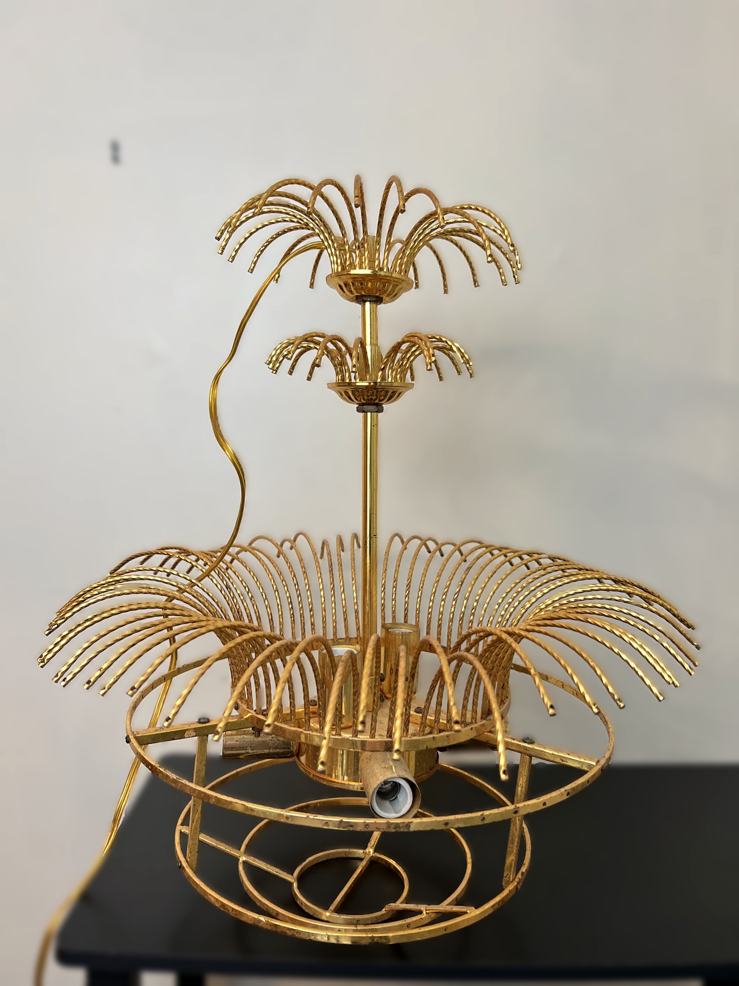 Wow this is quite the statement piece in gilt metal, although it needs a little TLC and some replacement crystals, this three-tiered vintage 1970s hard-wired chandelier would add character to any space.